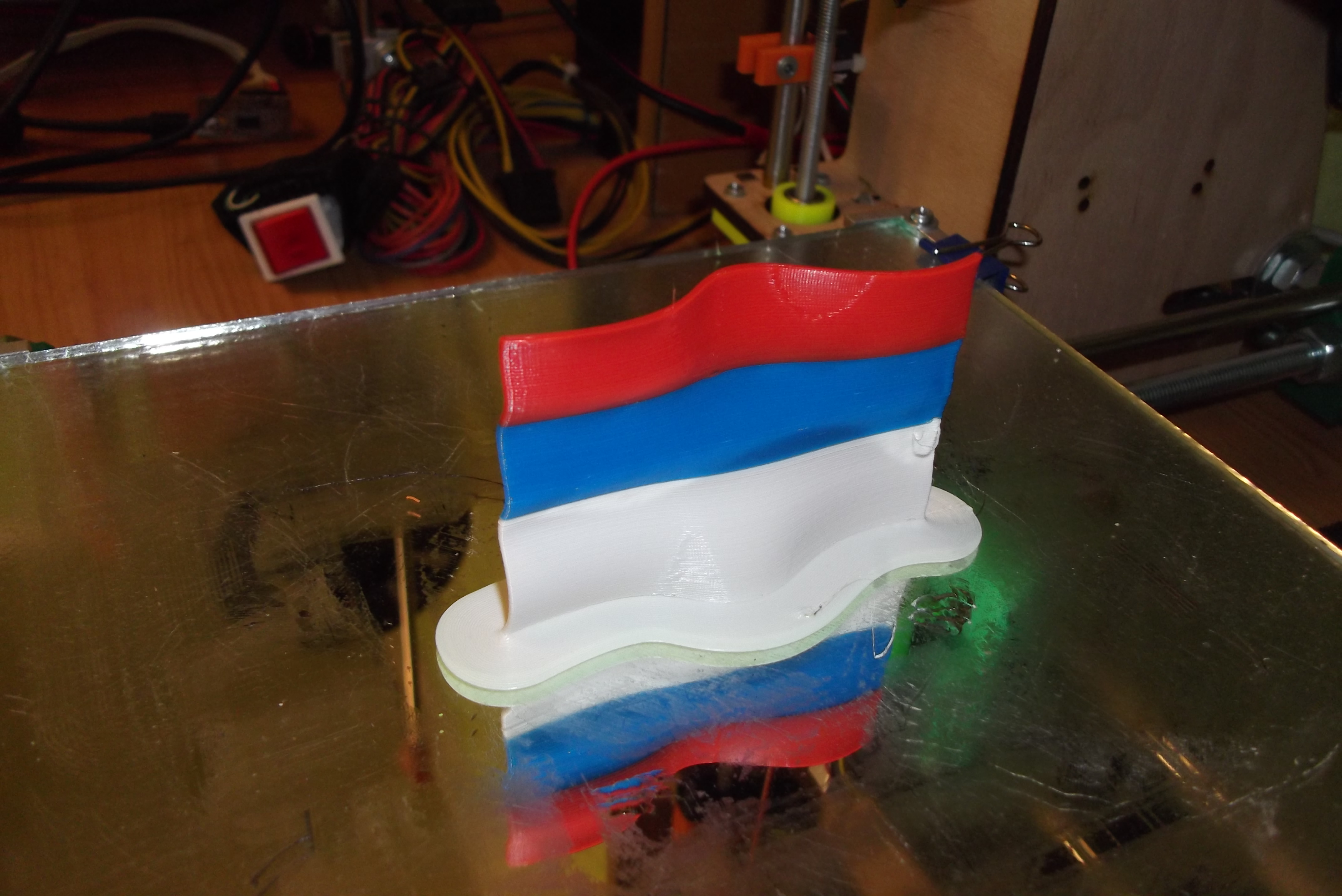 После этого ретрактом выталкивает весь пруток вверх. Вставляешь новый, нажимаешь кнопку и печатаешь дальше новым цветом.