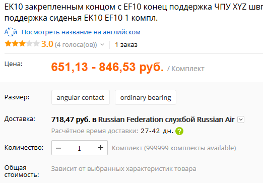 Что то я запутался. Вот тут https://ru.aliexpress.com/item/1pcs-EK1 ... 28328.html сразу комплект EK10+EF10 или порознь? И выбор предлагается angular contact и ordinary bearing, что выбирать? Обработку хвостов это нужно "купить" эту самую "Китай сделал конец обработки расходы" три штуки, по количеству ШВП и скинуть чертежи? Или как происходит это?