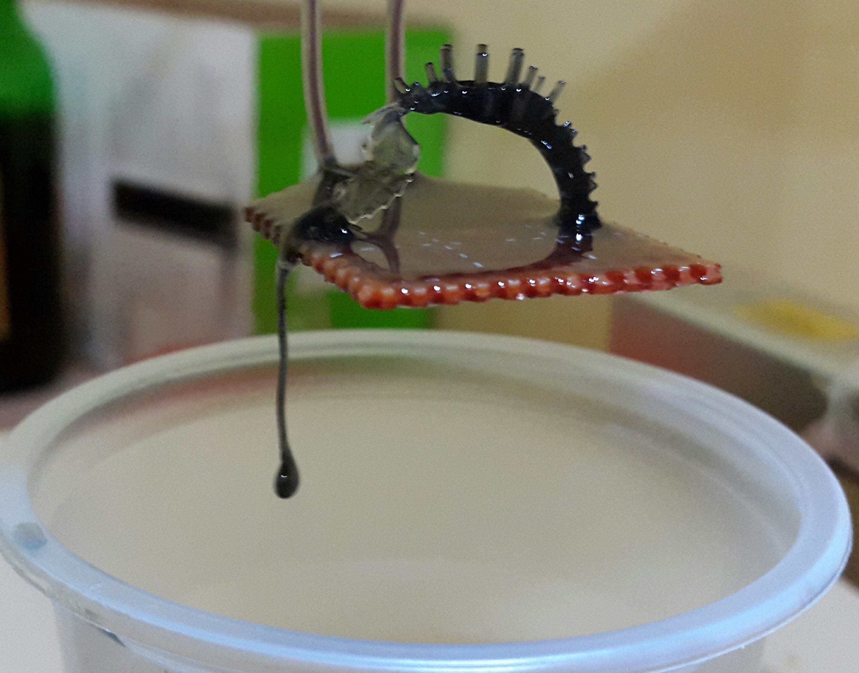 Сегодня провел важный эксперимент с соленой водой. Работает, полимер плавает и печать идет как обычно. Только вот надо очень плотный раствор соли. В неплотном плавать не хотел, тонул.