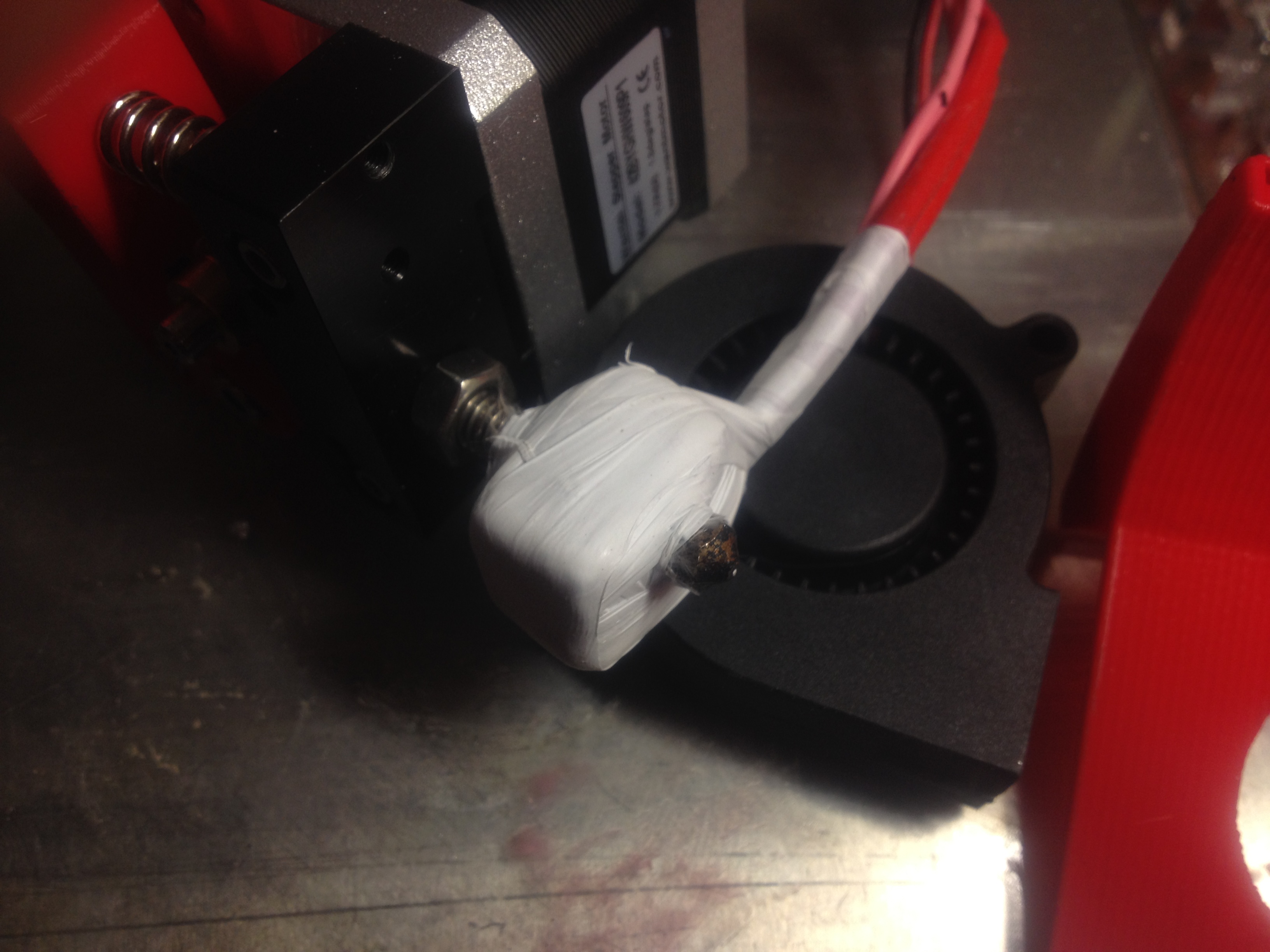 Вчера, послушав советы знающих, утеплил сопло. Обмотал полоской стеклоткани, и сверху лентой фум. На удивление, после окончания дымления стеклоткани (принес с улицы, возможно выгорало что-то) фум осталась как и была. Заодно закрепил нагреватель и терморезистор болтиком, по умолчанию там его небыло и резистор постоянно вылазил.