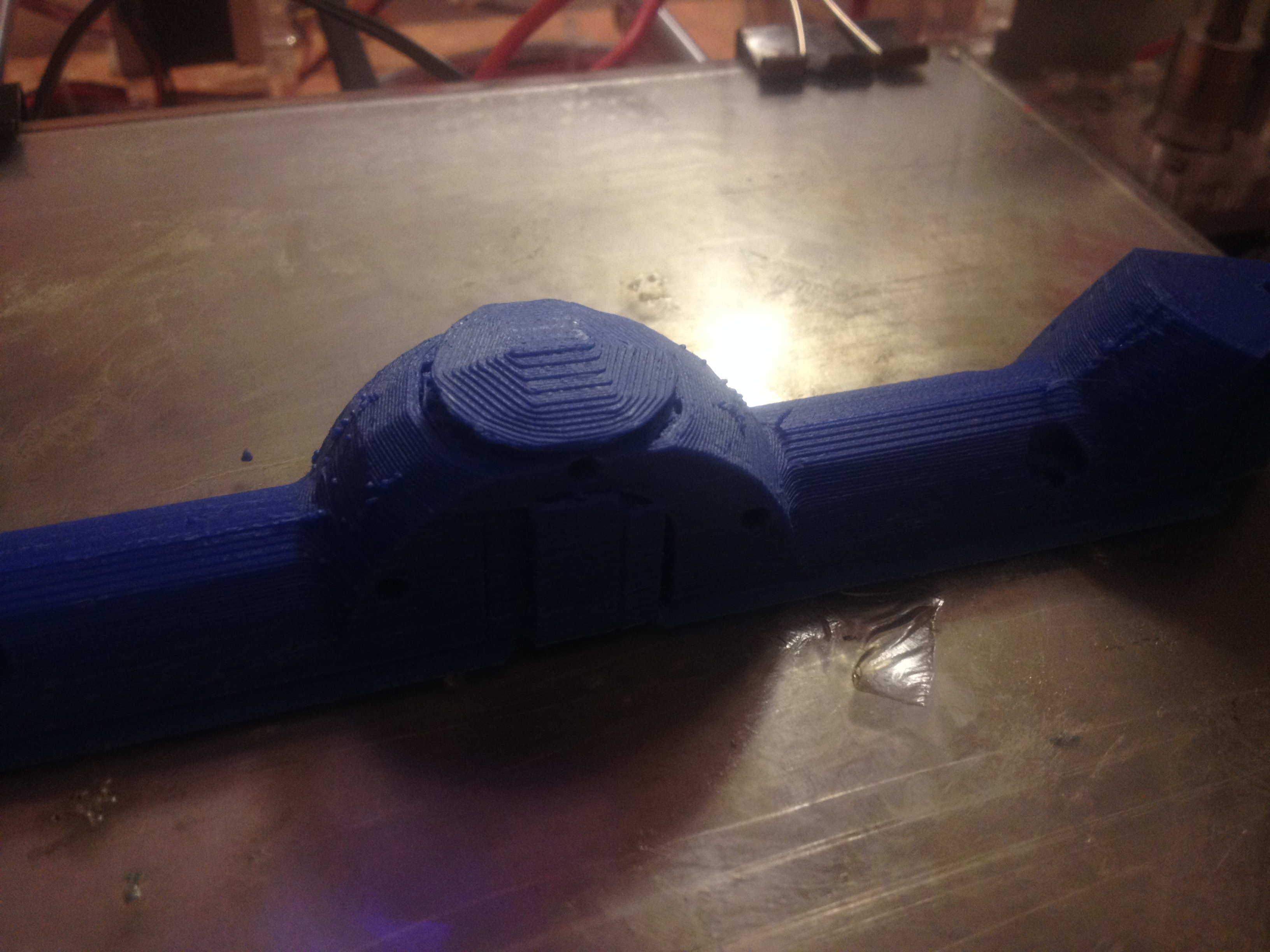 От чего может быть? Такое ощущение, что пластик закончился и снова пошёл через 1-2 слоя. Может затык в экструдере произошёл... "шапку эту" снял, попытался продолжить печать отредактировав код, но забыл поднять сопло перед началом печати... пришлось перепечатывать всю деталь. :oops: