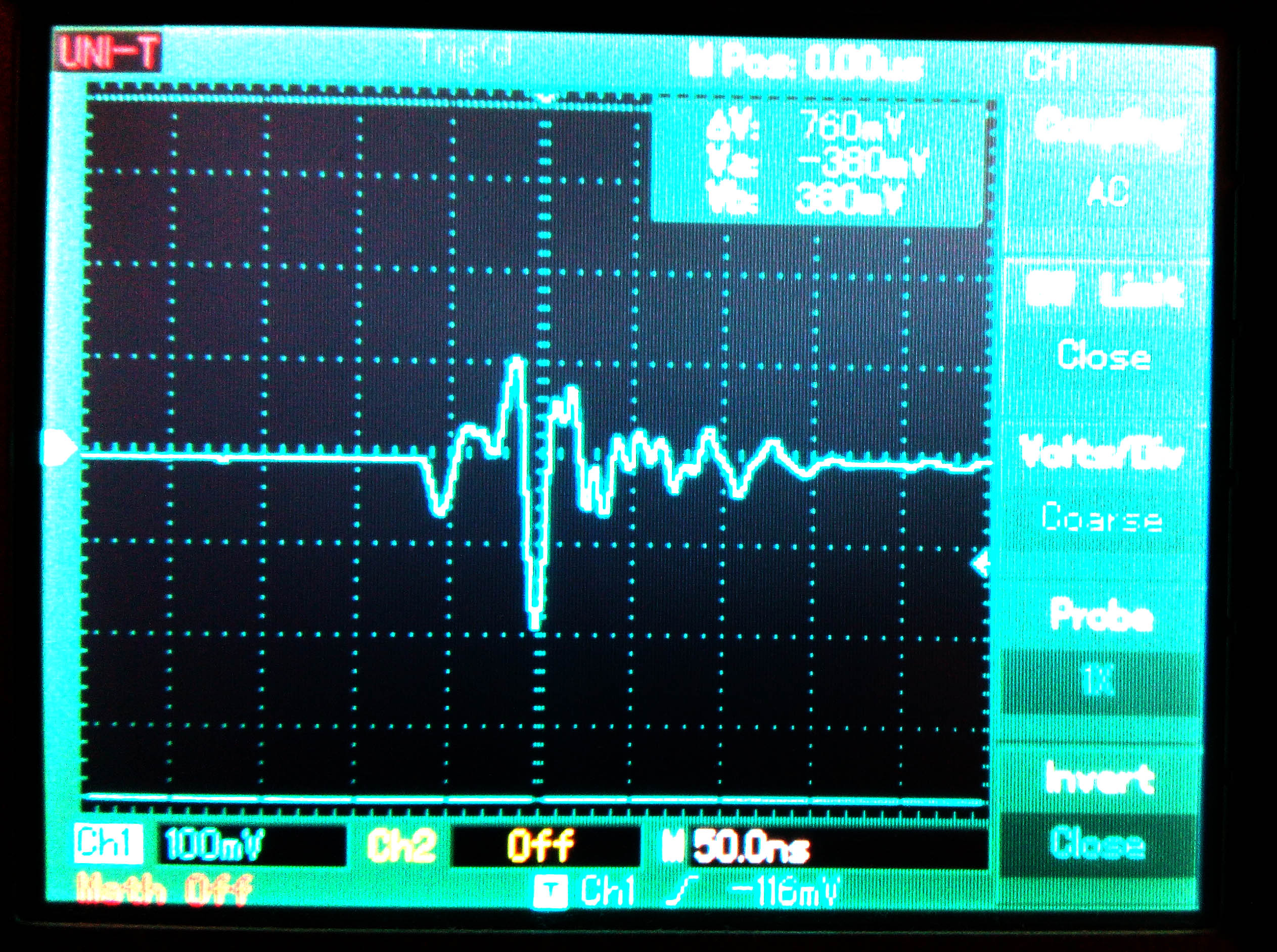 Подключил к питанию осциллограф и увидел, что во время работы стола появляется вот такая бяка: