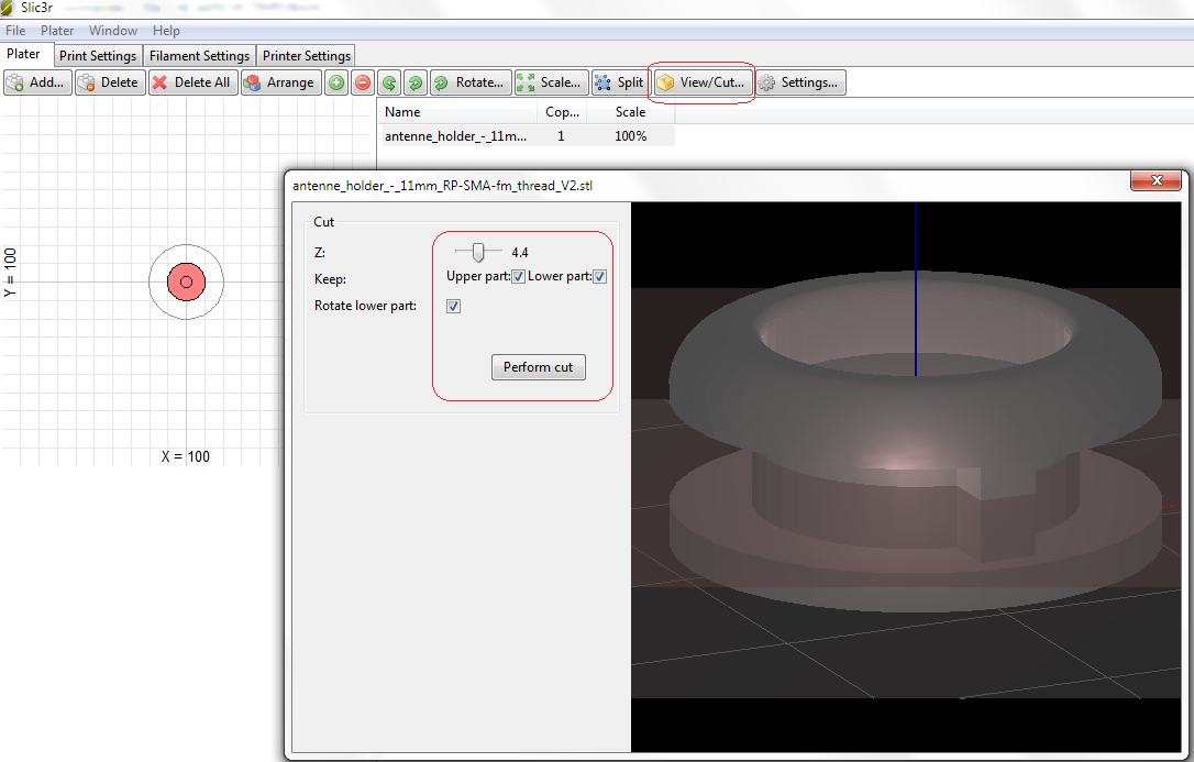Я режу netfabb basic(бесплатный), заодно проверяю целостность моделей. Если по шагам 1 сдвинуть модель на абсолютный ноль 2 отрезать сколько надо по Z (если по высоте резать).
