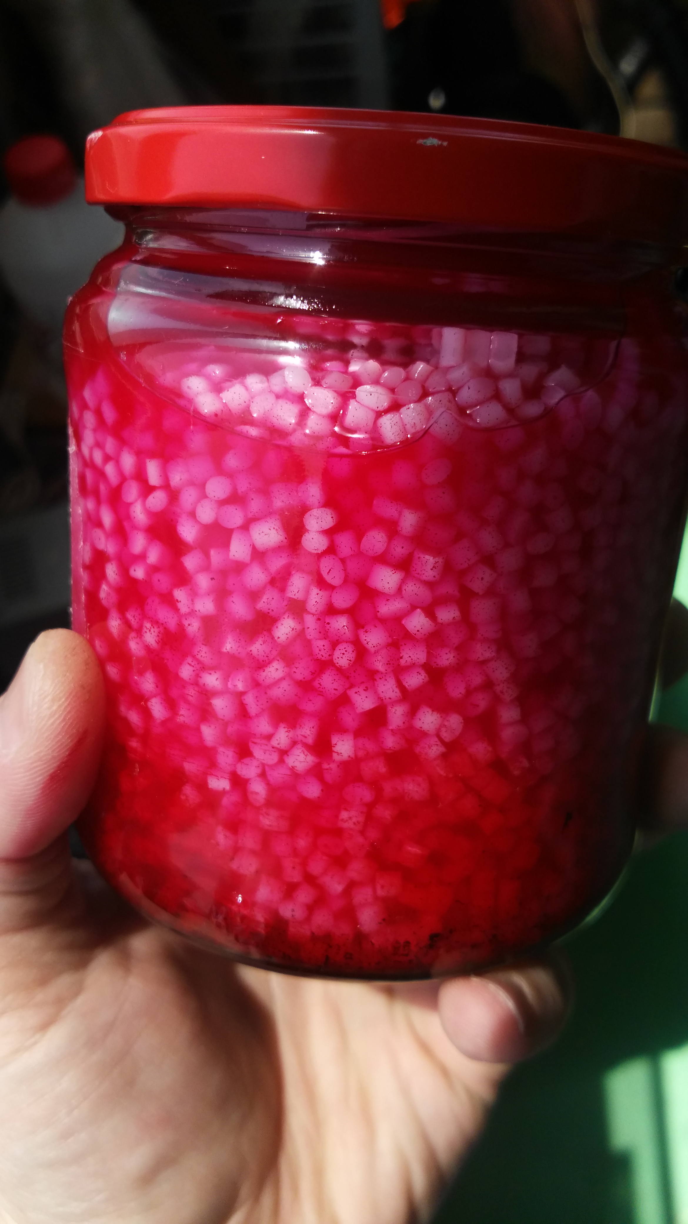 Это опять я, провел еще эксперимент на этот раз красителем было содержимое паст для шариковых ручек фиолетового цвета, правда на фотках почему-то синий получился. Взял содержимое 4 паст растворил в 50 граммах ацетона, и поставил на подоконник, кошка бежала хвостом махнула, хотя нет у нее нет хвоста, наверно задом махнула и пластиковая баночка упала на ленолеум и пару капель просочилось, теперь я это пятно ничем отмыть не могу. Потом взял этот краситель разбодяжил водой 1/1 и засыпал пластиком, подержал потом сутки часто перемешивая и вылил в поддон на сушку, неделю оно сохло потом я еще немного просушил на воздуходуйке и закинул в экструдер, результат уже неплохой, правда нить лезла не гладкая, но это наверно результаты предыдущих экспериментов еще не вылезли, при печати лезла очень красивая и ровная ниточка правда из-за того что намотчик нет, то слегка гуляет диаметр, но Пикачу я распечатал неплохо.