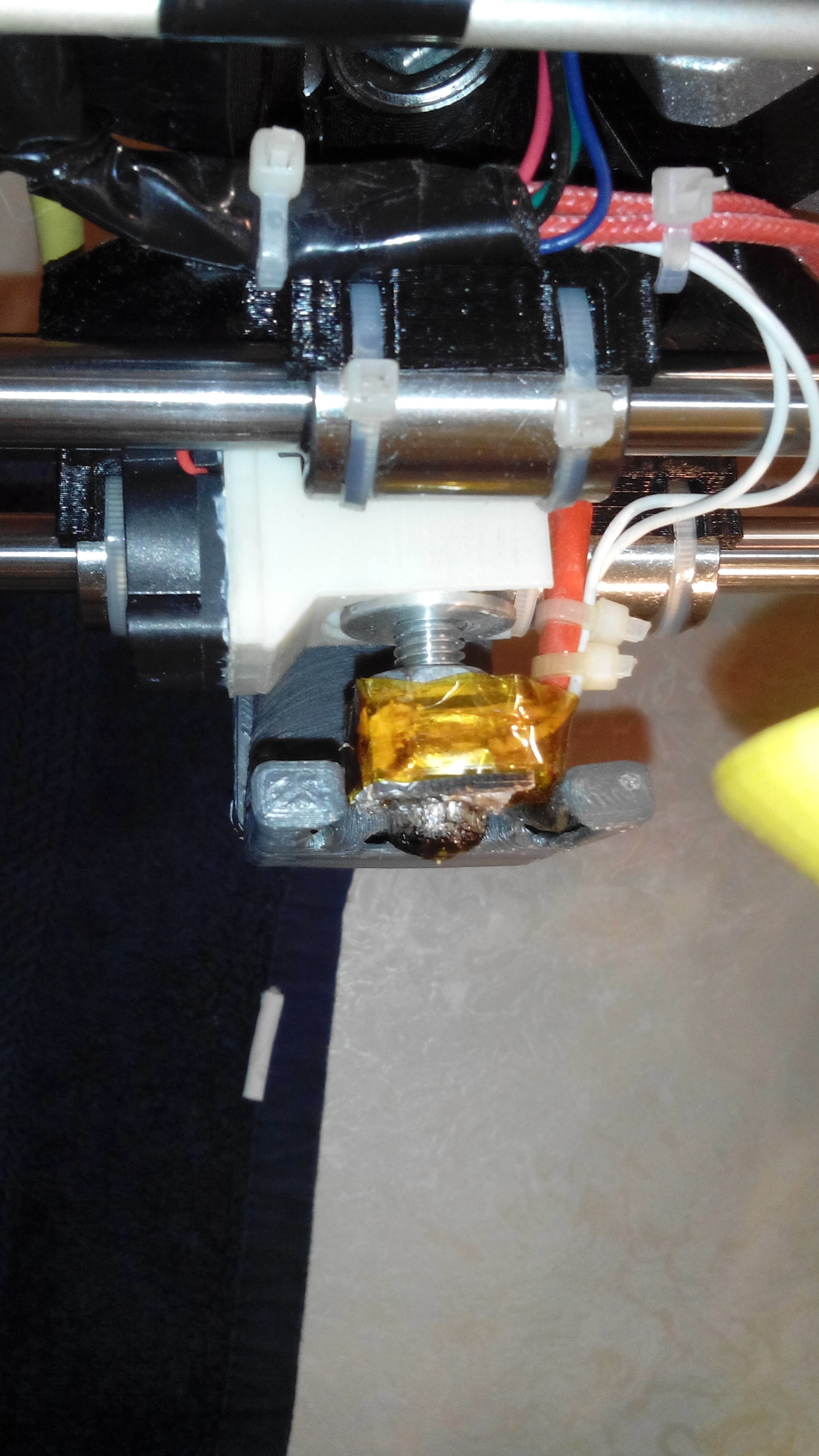 Значит резьбовая трубка вкручена в нагревательный блок на половину высоты блока. фторопласт отсекает тепло от прутка и собственно зона расплава только в сопле. И запас расплавленного пластика тоже только там. По уму фторопластовая трубка должна начинаться выше нагревательного блока, тогда он будет работать эффективно.