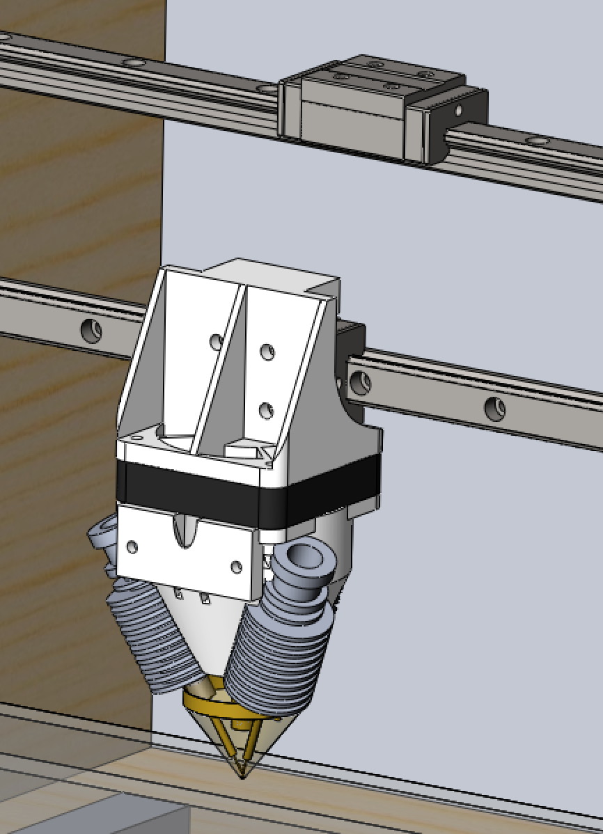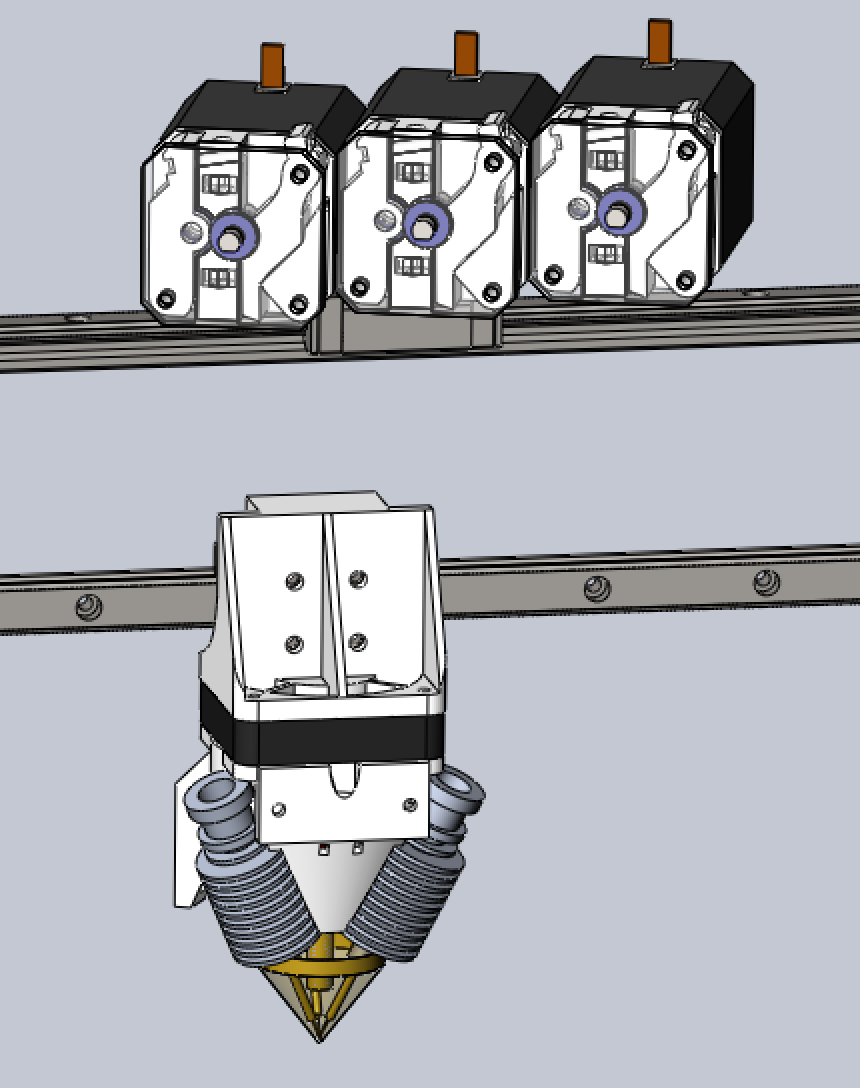 Но самое интересное - это концепт короткого bowden c тремя моторами которые крепятся на дополнительном рельсе выше печатной головы и находятся в пассивном режиме скольжения по ней.