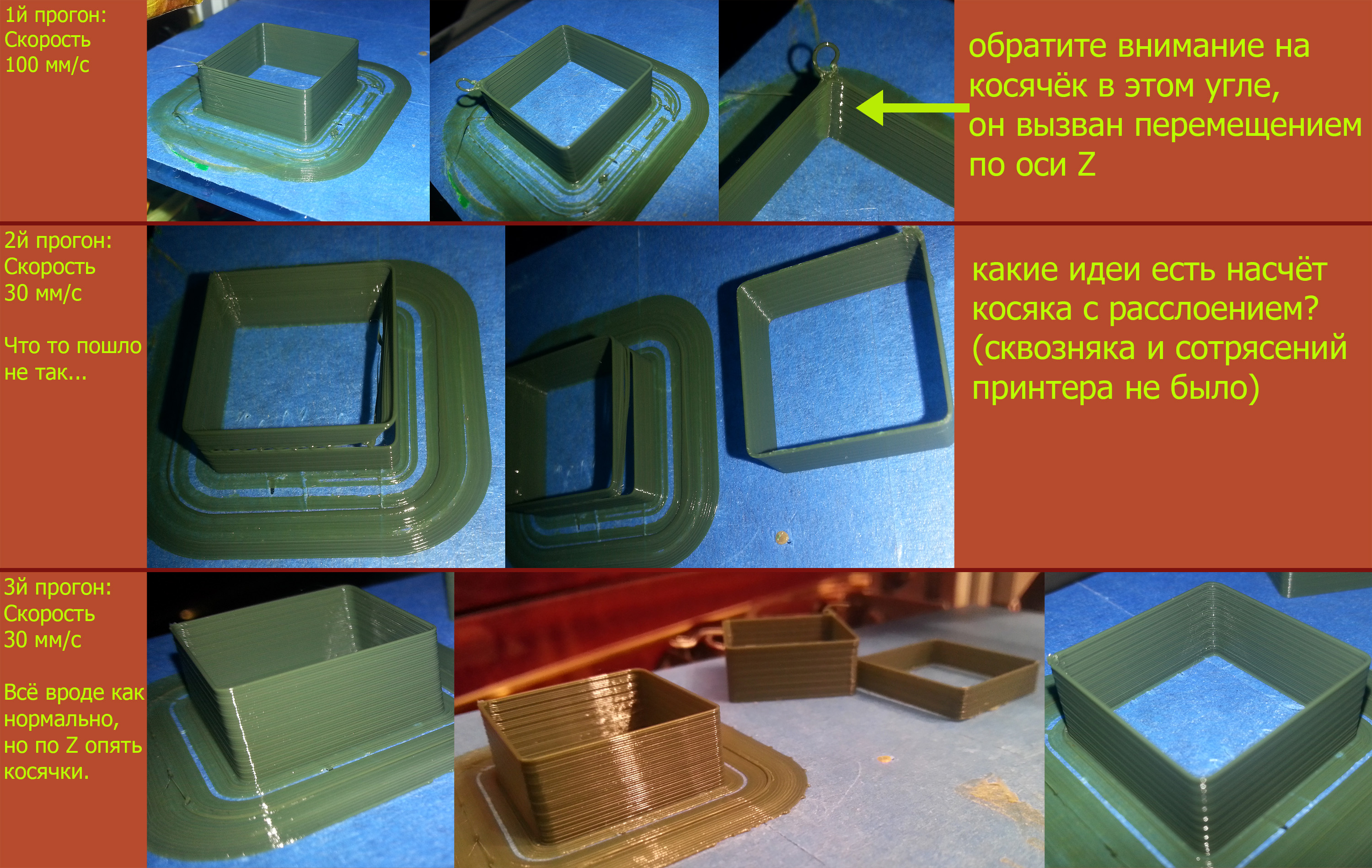3. косяк в углу это шов, у тебя боуден и такая проблема эта будет тебя навещать часто,