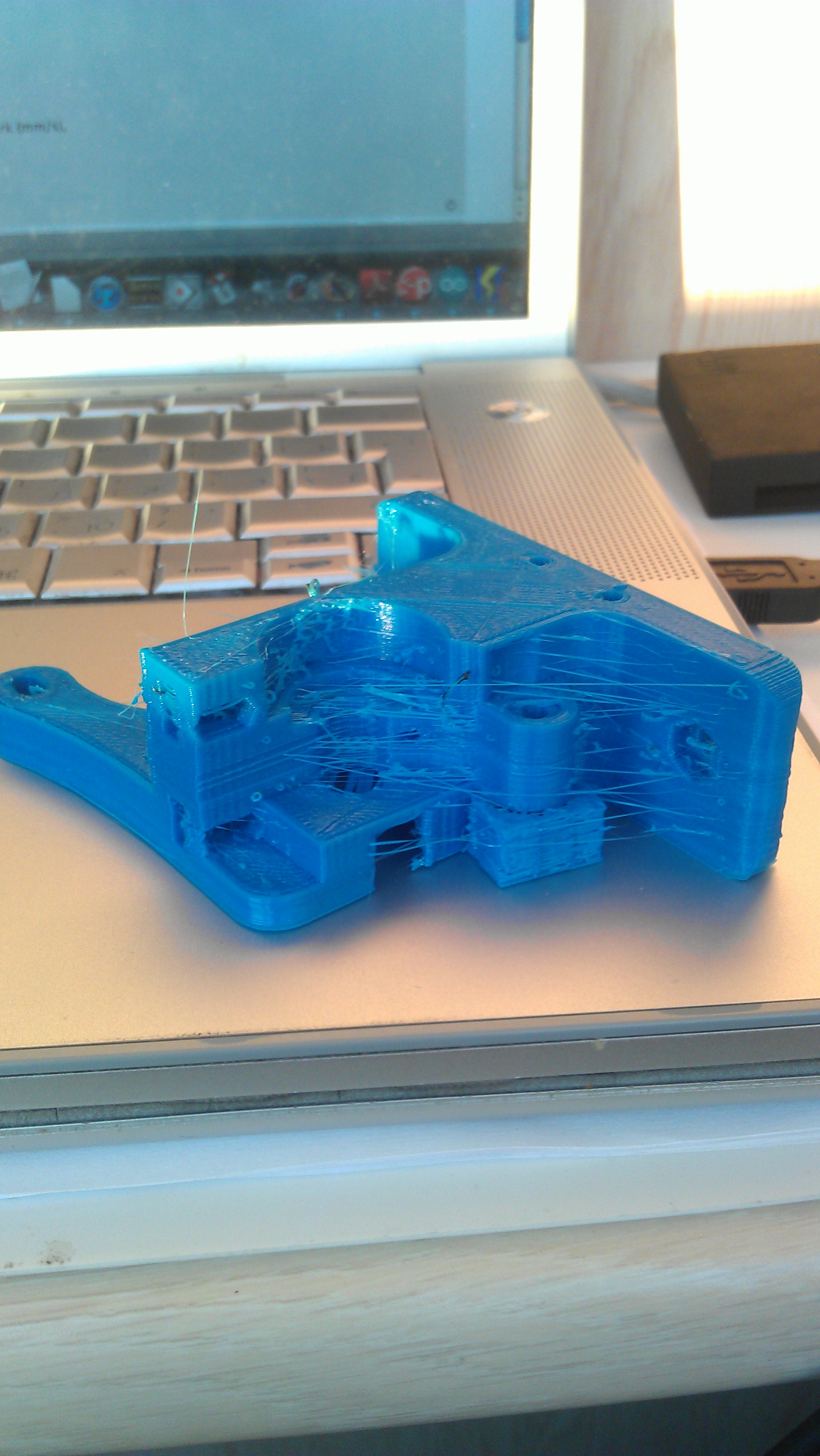 Сравниваю со своим двухэкструдерным клоном Мейкербота. Два экструдера, на каретке стоит сразу два тяжеленных мотора (один снял, т.к. все равно одним соплом печатаю - исключительно во имя снижения веса, т.к. инерция. При этом печатаю на скоростях лишь немного больших, чем стандартные настройки Слайс3ра (что-то там 55 против 45 вродь), т.к. имел опыт продолжительного подбора оной по печати одной своей пока не доделанной модельки. Скорость выше, начинаются волны на поворотах и т.д.