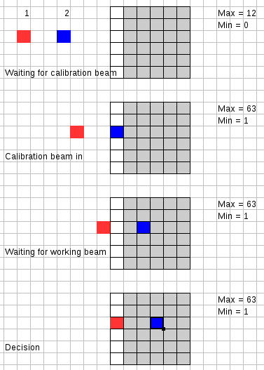 Поясняю. Опускающийся вместе с головкой блок датчика скользит по столу 2-мя пятнами. Сенсор с его полем зрения установлен перпендикулярно столу. Поле зрения неподвижно. Требуемый, он же исследуемый участок опускания головки начинается с момента входа первого пятна в поле зрения сенсора (касание пятном поля зрения). Далее пятно от первого луча проходит всё поле зрения сенсора и покидает его. Сенсор, как сказал Андрей, перестал судорожно цепляться за пятно, - исходное состояние сенсора, которое было до входа первого пятна, стали равными для последующего входа в поле зрения сенсора второго пятна.