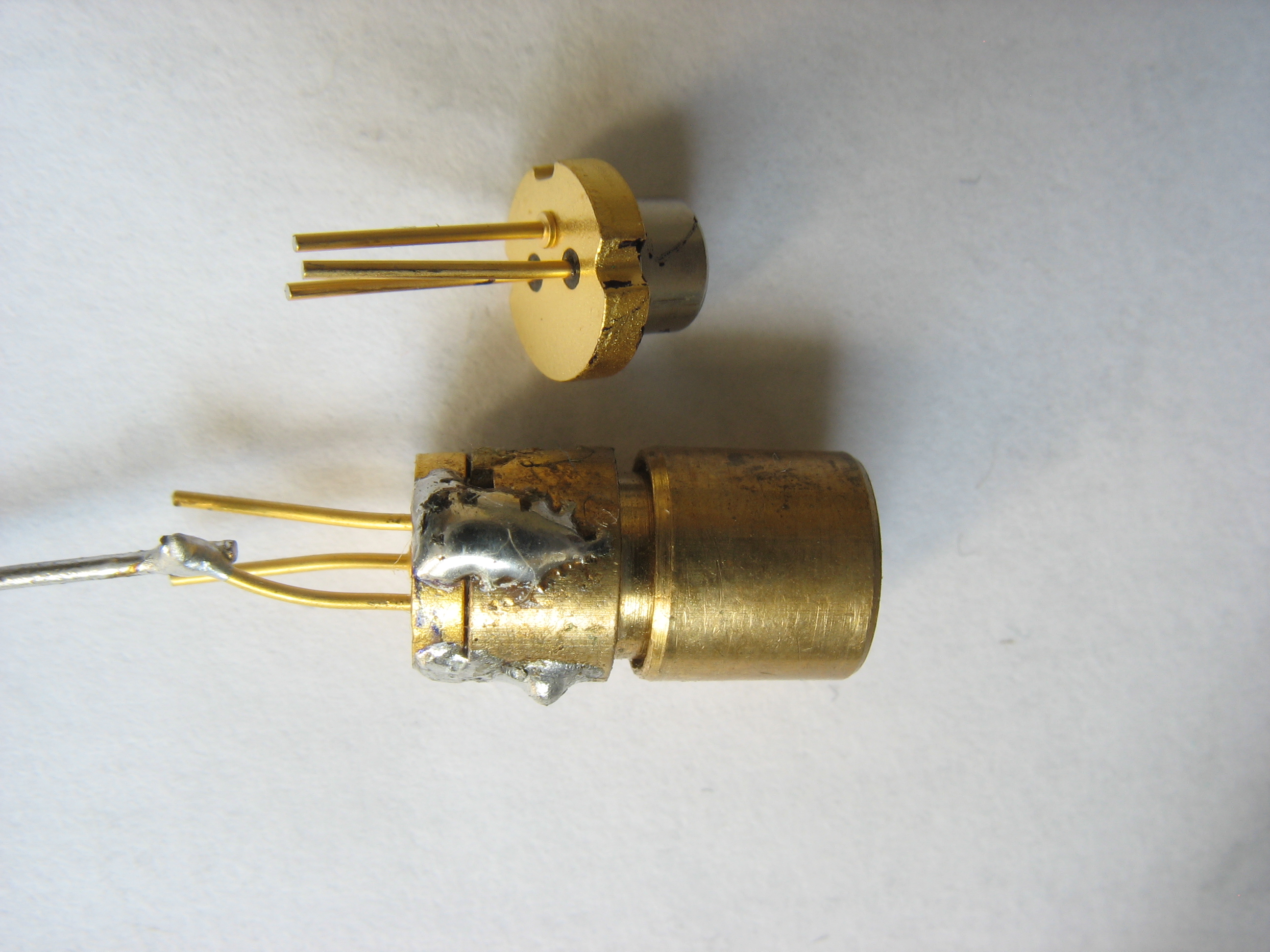 Сейчас бы делал по-другому. Предварительно залудить внешнюю сторону втулки в месте крепления лазера. Следить чтоб олово не затекало на внутр. часть трубки. Промыть втулку и запаять лазер.