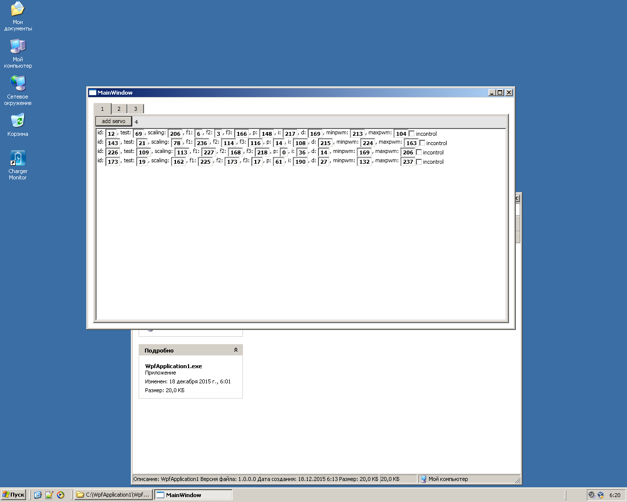 второй момент, что оно работает на биндингах. тут только малая часть плюшек биндингов используется - на всех трёх источник данных один и тот же. в самом впф элементы тоже гибко на биндингах завязано (размеры, содержимое, относительное положение, анимация и т.д.), просто я это тут почти не использовал. использовалась по сути только немного - привязка источника данных для заполнения элементов. допустим у тебя там есть поле incontrol. делаем в стиле кнопочки "соединить" и "отключиться", привязываем их поля visible к incontrol и получится, что когда incontrol = true, видна кнопочка "отключиться", когда false будет видна "соединить". тыц, профит. или можно менять цвет строк по какому-то алгоритму, допустим стандартное выделение чётных и нечётных строк. или можно привязать цвет фона к какому полю и допустим при выходе за определённый интервал менять цвет на зелёный, желтый или красный. в реальных софтинах, если прям с привязкой к железкам, так полезно для индикации заряда акума или ещё чего подобного.