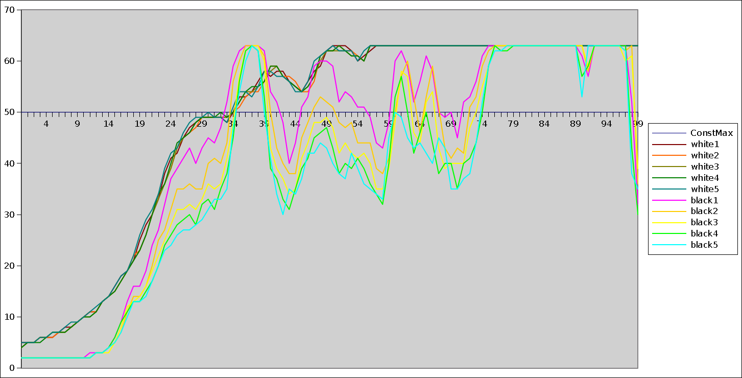 Обратите еще внимание на несовпадение кривых на быстром проходе. Первый провал на белом фоне не смотрим, т.к. это чистый наклон импульсной характеристики интегратора. На черном фоне все кривые находятся друг в друге (не считая шума). Это говорит о повторяемости результатов на низкой скорости. На больших скоростях датчик больше замеряет фазовые шумы интегратора. Какая кривая раньше отреагировала, та и будет потом всю дорогу раньше на графике.