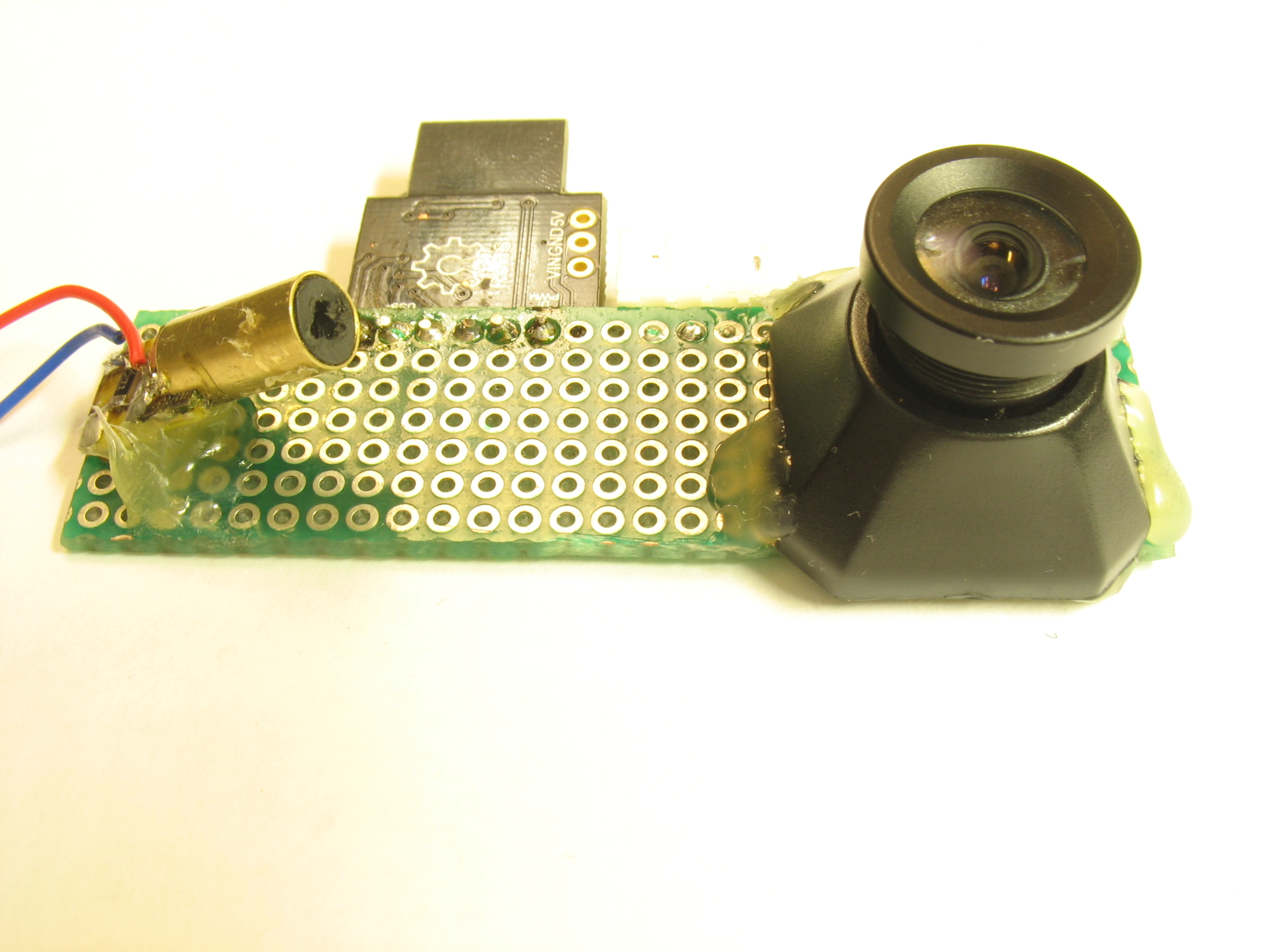 Пины не совпадают с макетками 2.5 мм. Выводы тянутся до след. отверстий. Под контакты положил фторопласт с клеевой основой. Доп. деталей всего 2, кондер по питанию и кондер на Vref. Микросхему, на всякий случай для дальнейшей возни с Pixel_Grab, развернул первым рядом к лазеру с учетом зеркалирования обьектива. Как показало послед. включение, с ориентированием не угадал