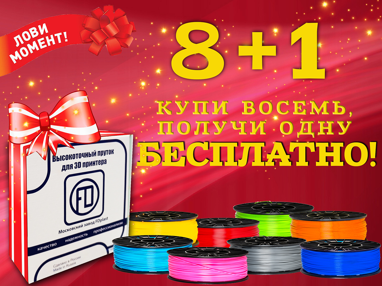 Купи 8 катушек, девятую получи в подарок! В акции участвуют ВСЕ прутки завода FDplast (любого материала ABS, PLA, HIPS, любого диаметра 1,75, 3 мм, любого объема 0,75 кг. 1 кг. 2,5 кг.)