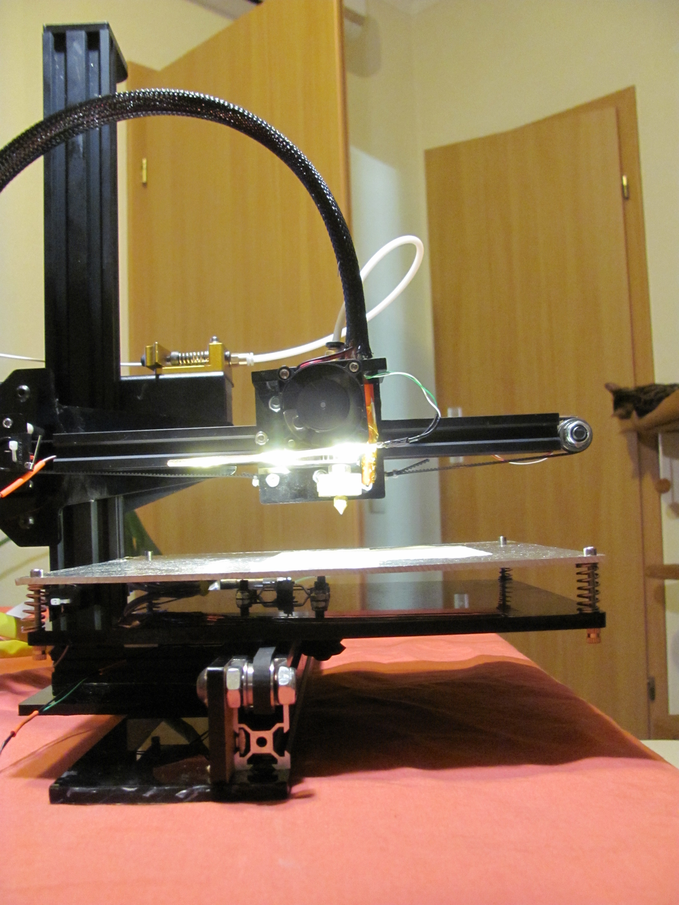 а заодно и немного модернизировать моего 3д друга - сделал разводку на концевики в макс положении (после пары неприятных моментов), подвел провода к экструдеру для кулерра обдува модели и сделал подсветку области печати из светодиодной ленты.