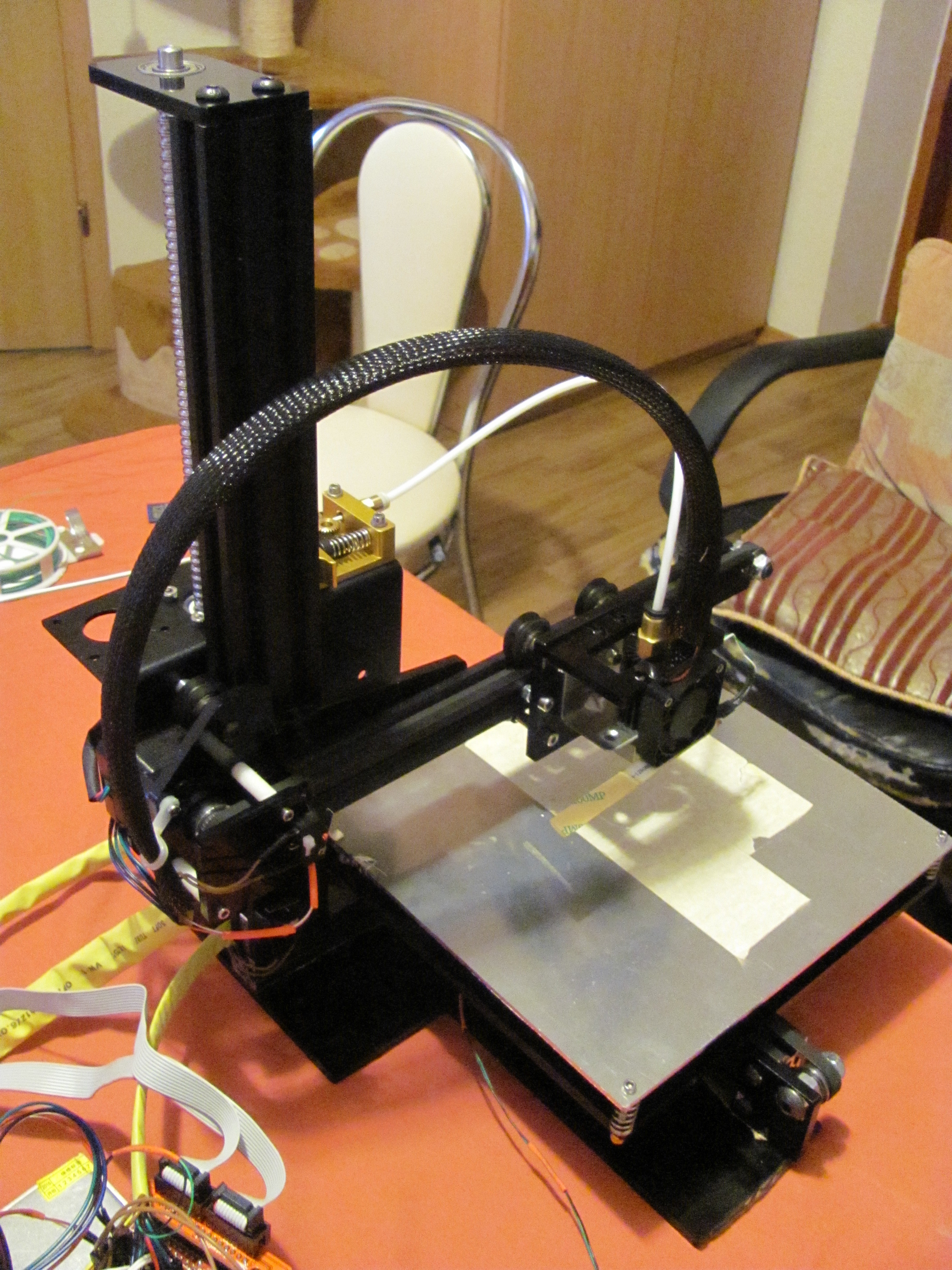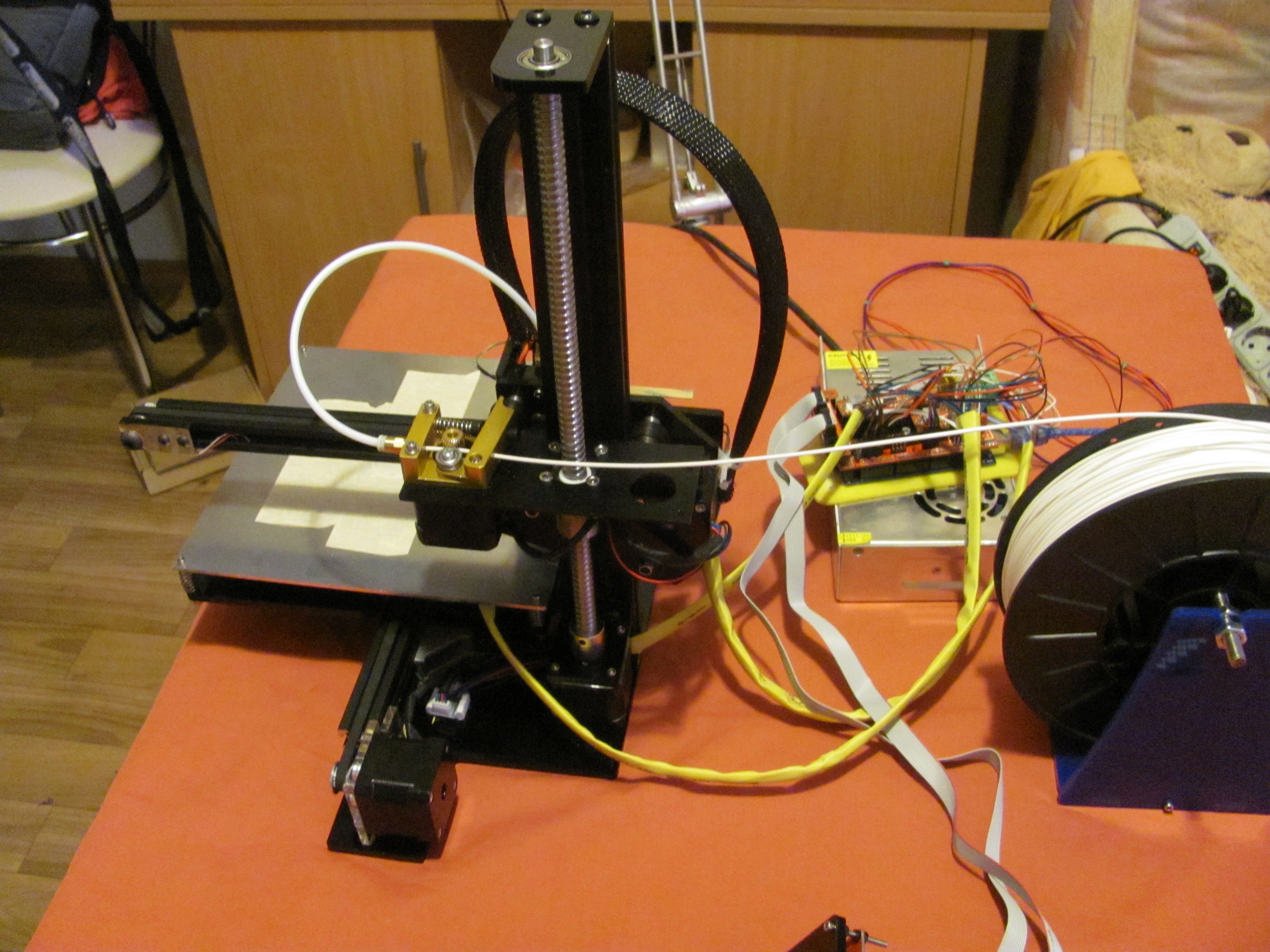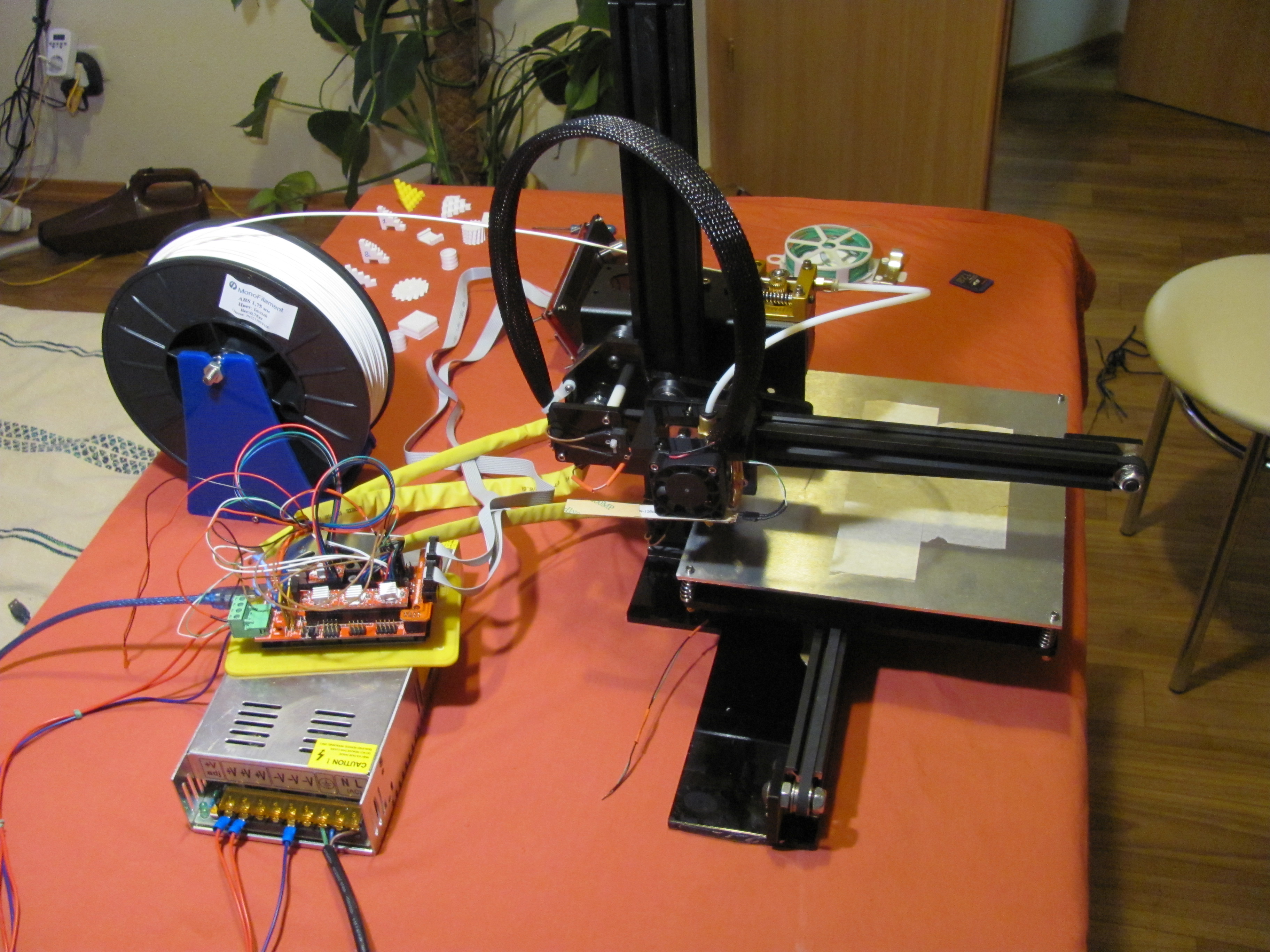 После подключения обнаружились проблемы - не грелся хитер хотэнда и стол, хотя напряжение подавалось - оказалось что провода этих деталй были просто перебиты... в общем поскручивал на клемники пока продавец отправил тем же DHL новые запчасти. Теперь на столе стоял полностью рабочий, но совершенно не откалиброванный принтер