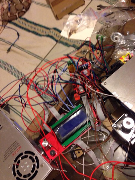 После подключения обнаружились проблемы - не грелся хитер хотэнда и стол, хотя напряжение подавалось - оказалось что провода этих деталй были просто перебиты... в общем поскручивал на клемники пока продавец отправил тем же DHL новые запчасти. Теперь на столе стоял полностью рабочий, но совершенно не откалиброванный принтер
