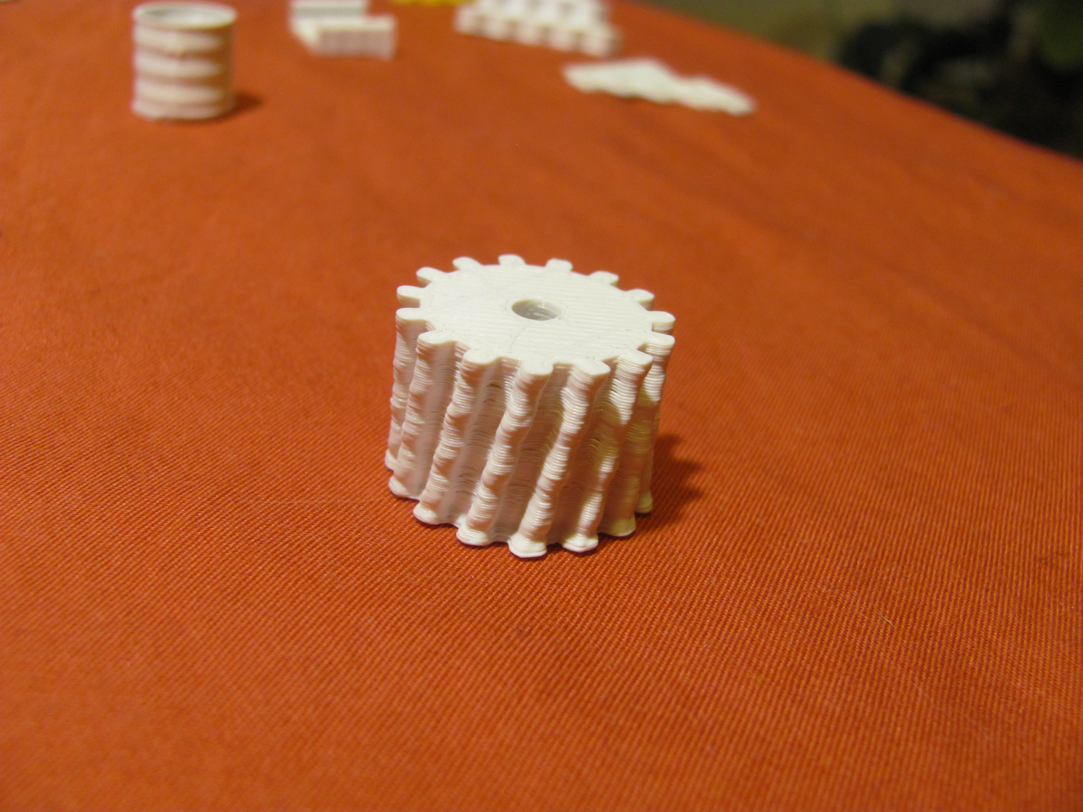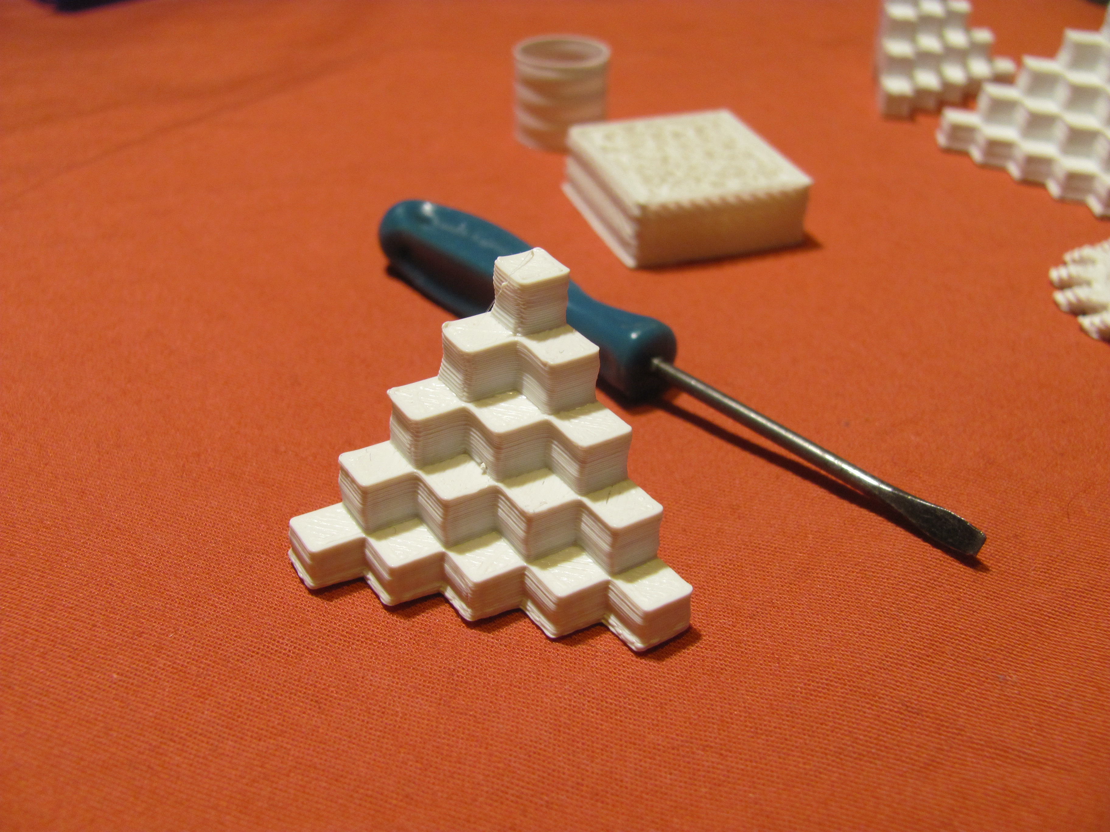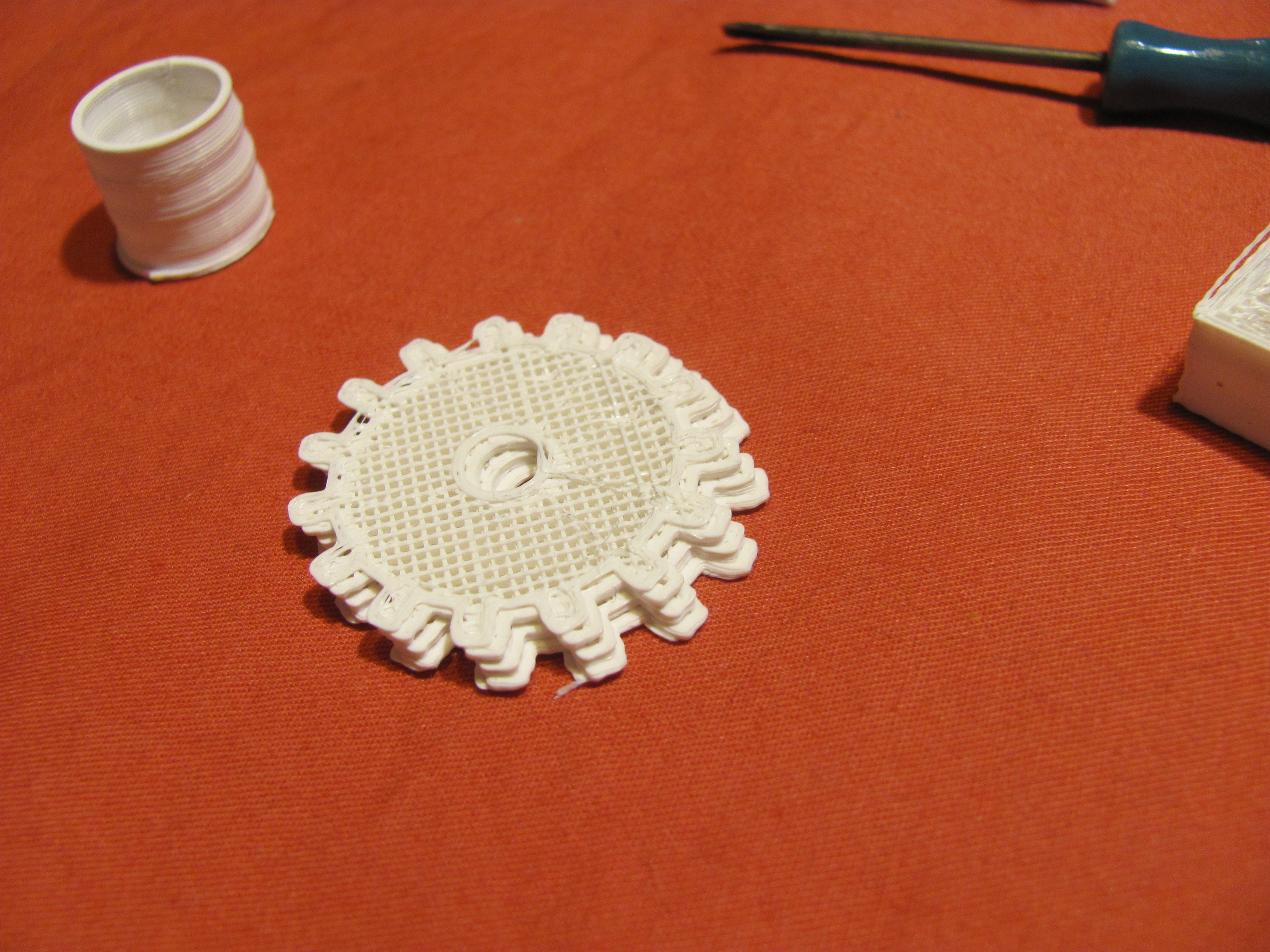 первые пробные печати - не очень успешны - сначала из-за не зажатой шестеренки на Х было смещение слоев - но для новичка это не было очевидно...