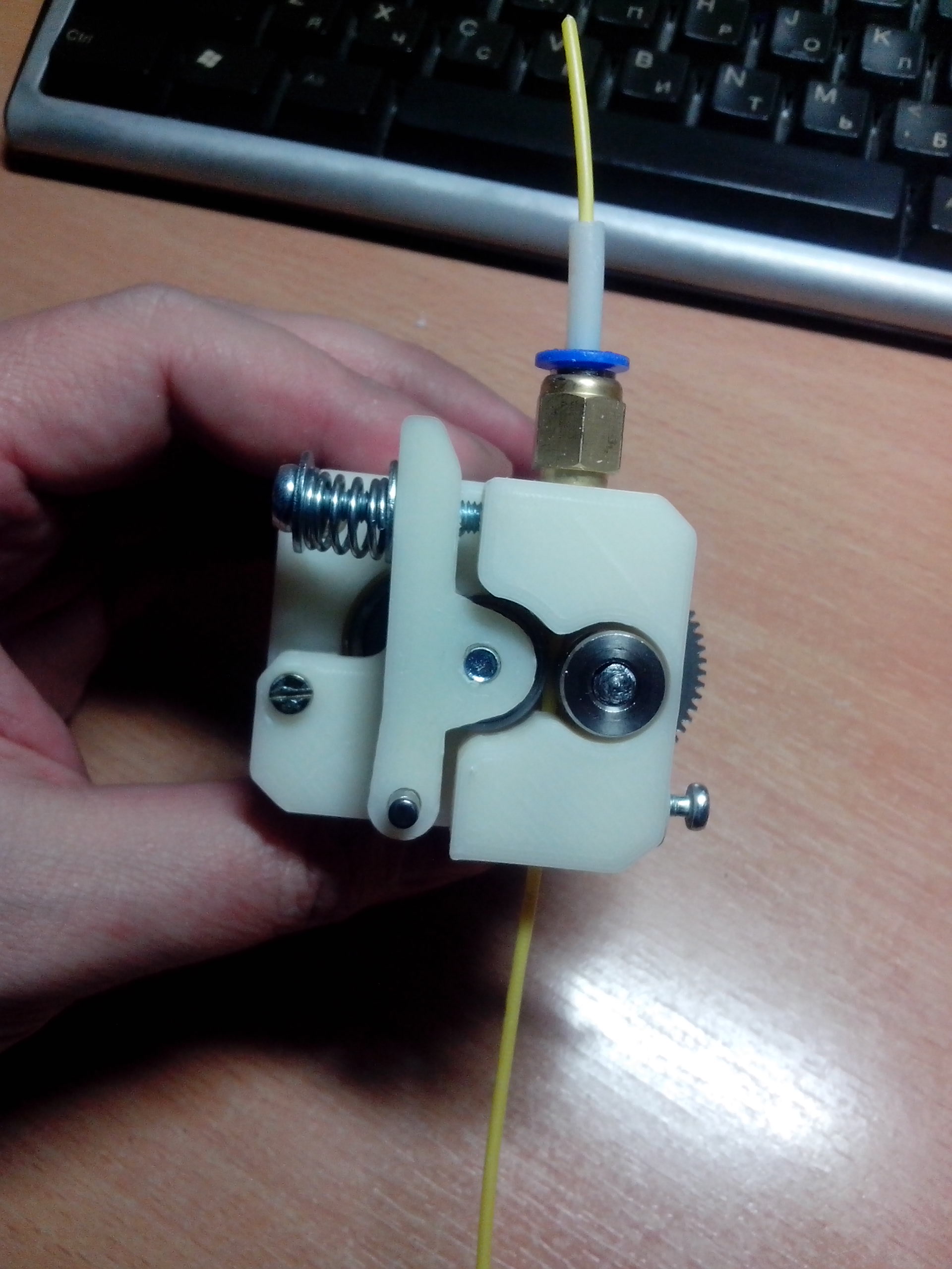 Что касается использования двух таких экструдеров. В принципе я себе такой задачи не ставил, но если напечатать 2 зеркальных экструдера и проставку толщиной 8мм между ними, то работать будет. Так же при замене болта на вал 5мм и зубчатую шестеренку от экструдера мк8 и соответственной замене подшипников на меньшие, можно уменьшить большую шестерню для вписания ее в габариты экструдера. Тогда можно обойтись без проставки и сэкономить 8мм. Но и редукция снизится.