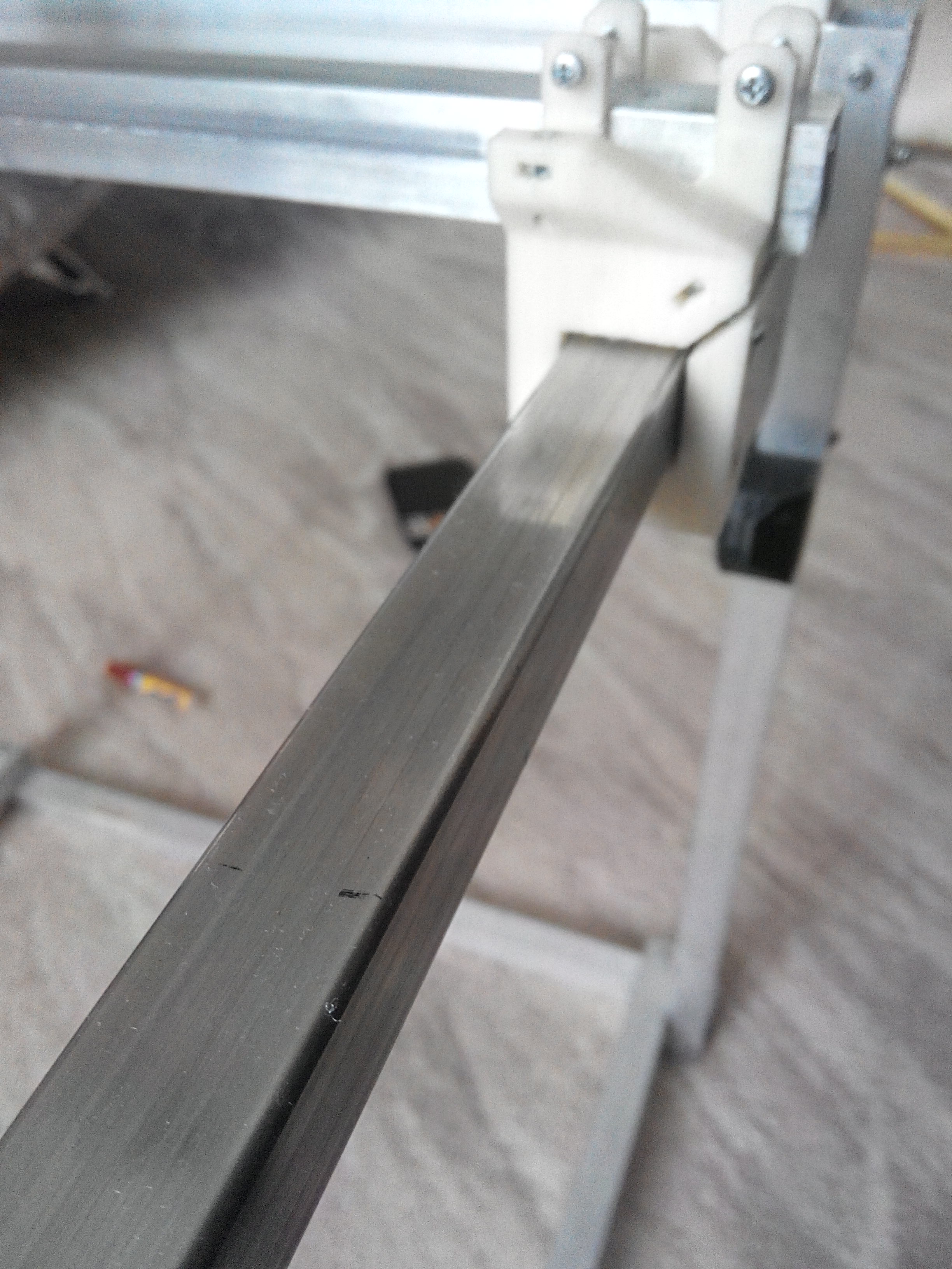 В принципе это можно использовать если хорошо отрегулировать подшипники или прижим. Можно использовать пластиковые (например нейлоновые) ролики вместо стальных подшипников, но мне эта перспектива не очень нравится в первую очередь из-за их труднодоступности.Тестировал трубу из нержавейки. Намного лучше. Дорожки хоть и появляются, но почти незаметны. Нержавейка очень скользкая, её очень сложно сверлить. Пришлось заточить победитовое сверло под перо и только так со смазкой я смог её просверлить. Вторым минусом является её вес. Труба 20х20х1.5мм длиной 500мм весит около 300 гр.