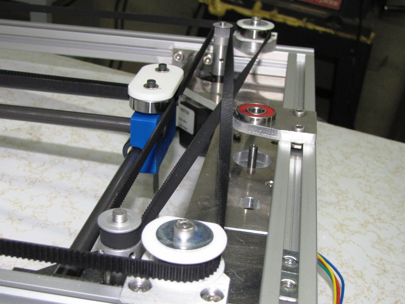 Уже пришли рельсы, валы, подшипники и шкивы, делаю пробную сборку. Собирать профиль оказалось не так просто с точки зрения геометрии. Металллические пластины позволяют профилю шевелиться, поэтому приходится точно выставлять профили перед затягиванием болтов. Напечатал накладные пластины с рёбрами для точной взаимной фиксации профилей. Они обеспечивают точные углы, но слабы на скручивание, поэтому рама приобретает жёсткость только при полной сборке.