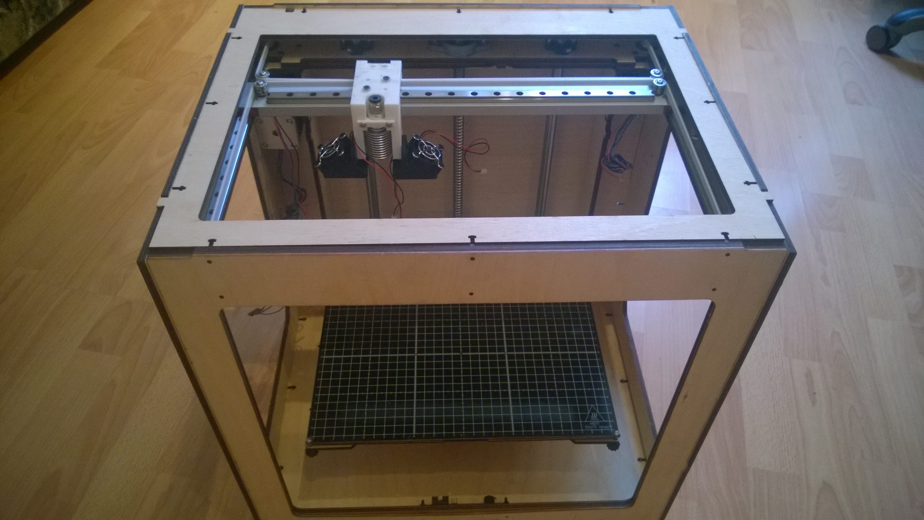 Корпус из фанеры, консольное крепление стола и роликов, H-Bot. Но эта тема про рельсы...