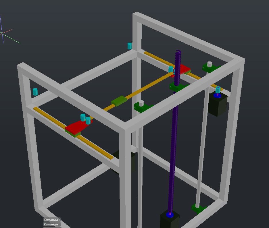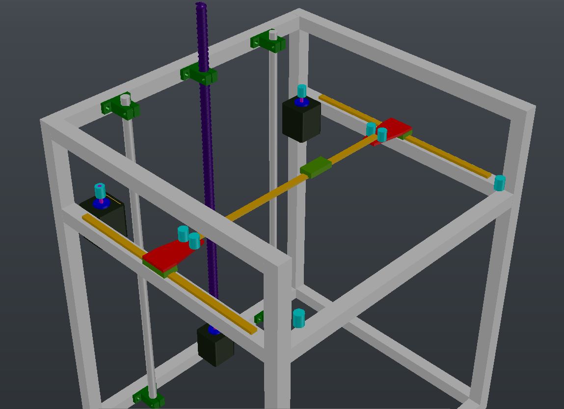 из того что есть - 3 линейные направляющие с каретками 4 см (на рисунке желтые и зеленные соответственно), держатели направляющих SK12 и 12 мм валы к ним, вся электроника. пока нету только красных штук, которые будут основой для Н-bot системы, планирую их печатать, но понимаю что от их жесткости зависит качество печати, не должно быть никаких люфтов, сручивания, деформации - поэтому печать наверное не самый удачный подход к этому узлу - может кто-то что-то подскажет пока я еще не заказал порезку профиля, что подправить и еще предусмотреть?п.с. за чертеж не ругайте, черчение не изучал, с автокадом разбирался по видеоурокам, самые мелкие детали - уголки и т.д. не указывал