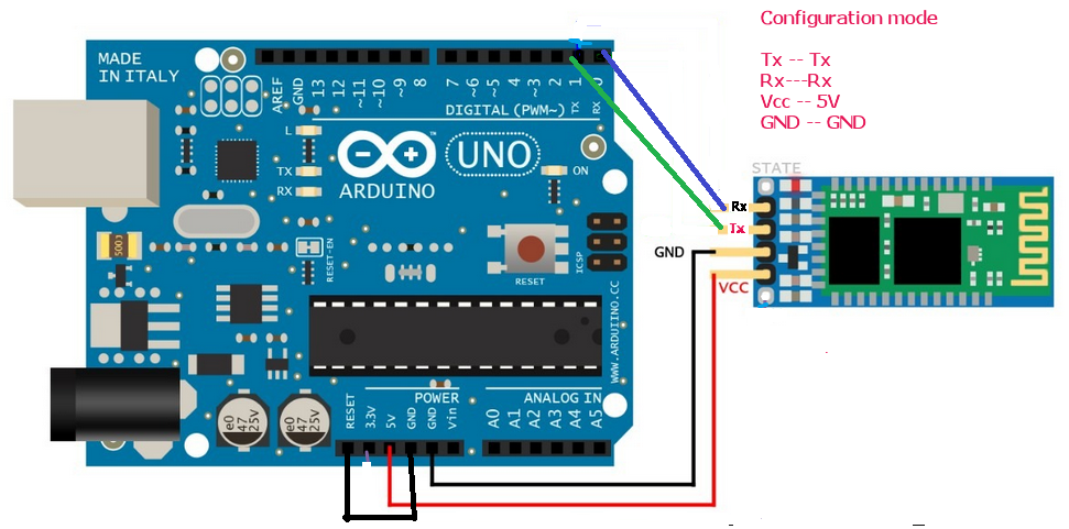 1) Для начала надо сконфигурировать НС-05 модуль, можно через ардуинку если нет USB-UART программатора, схема на картинке.