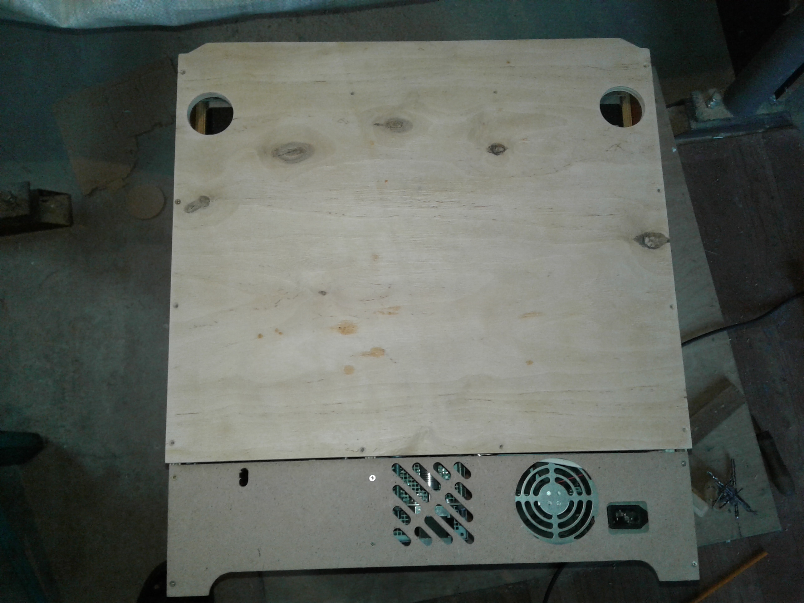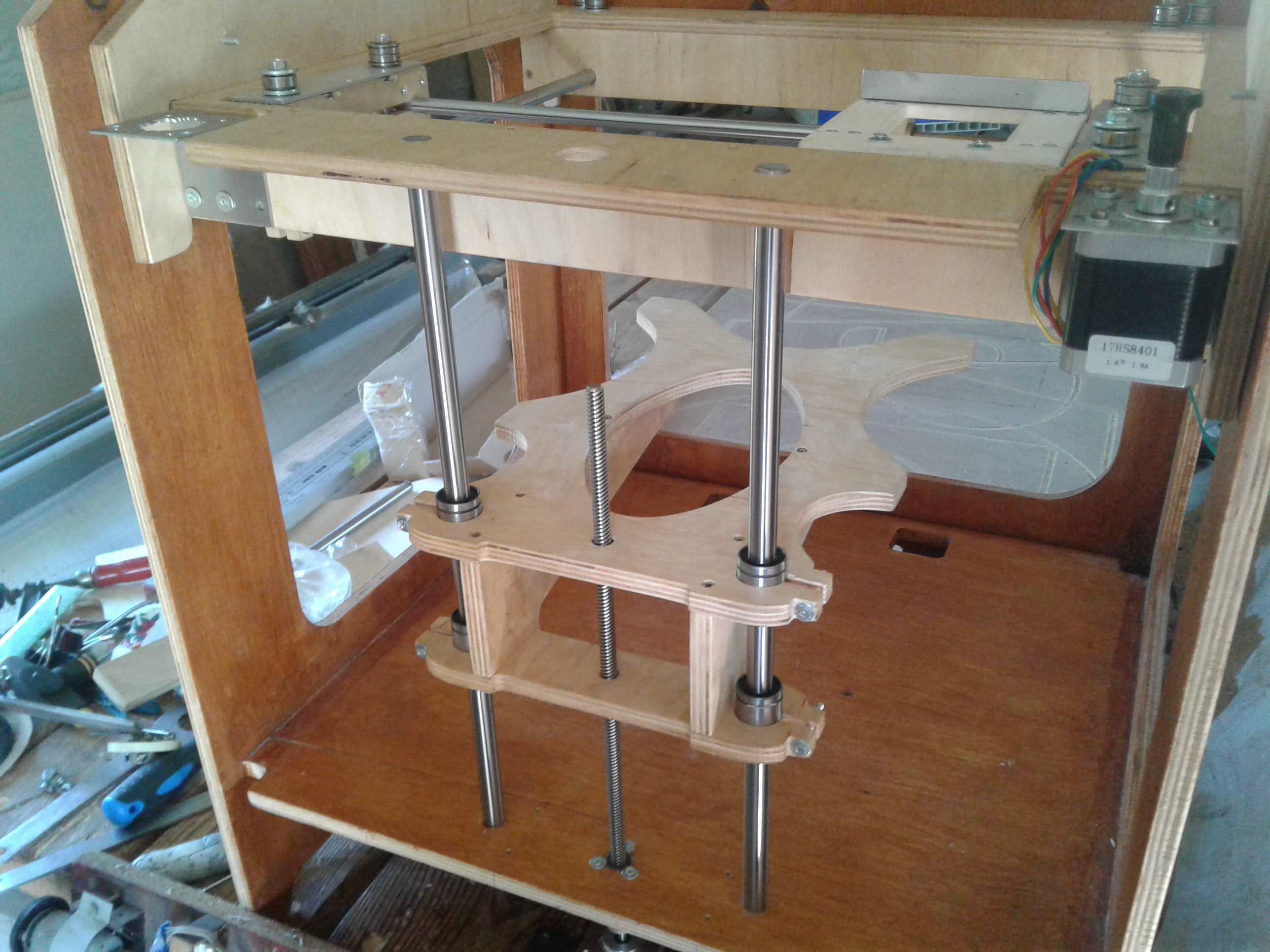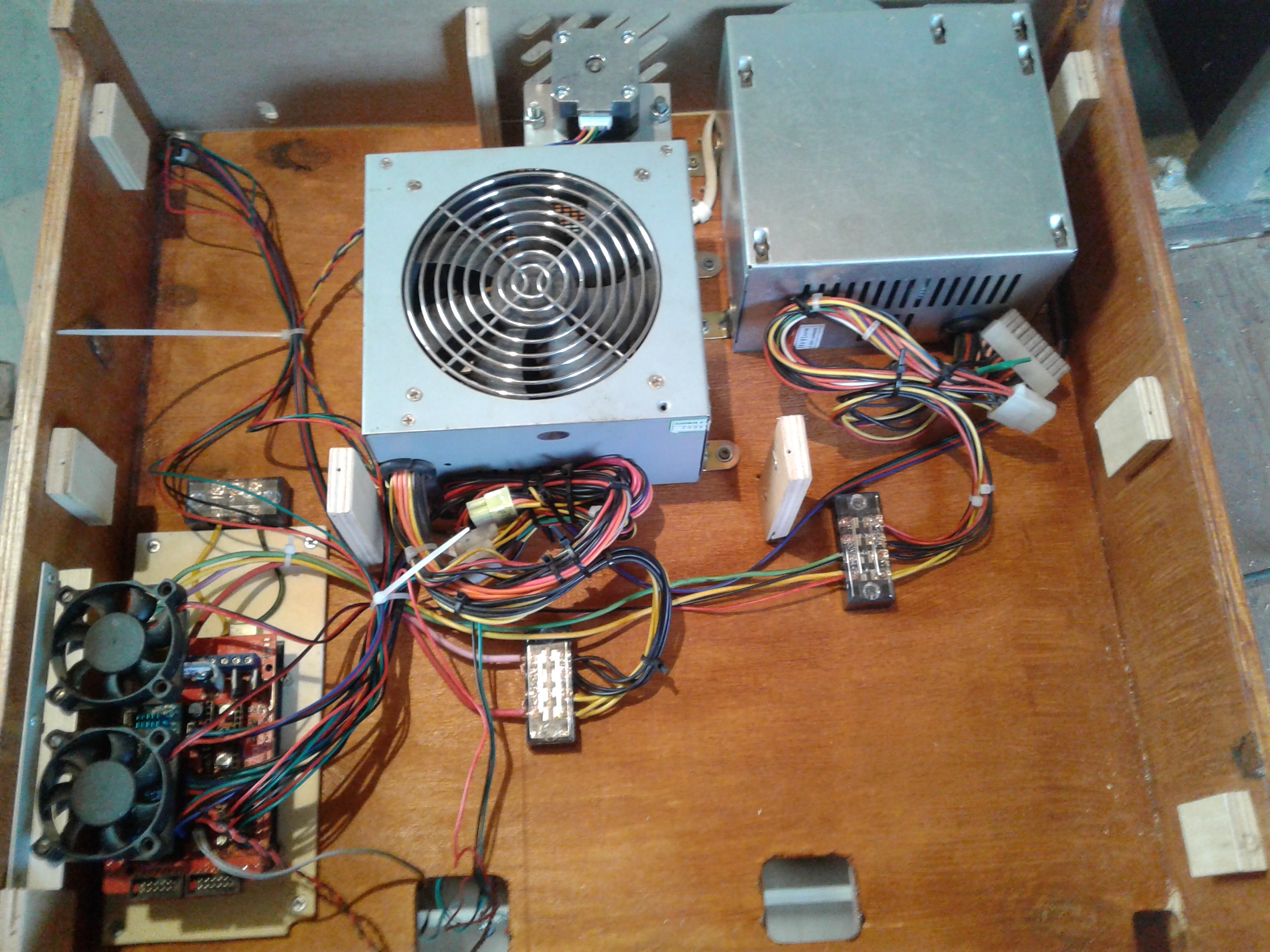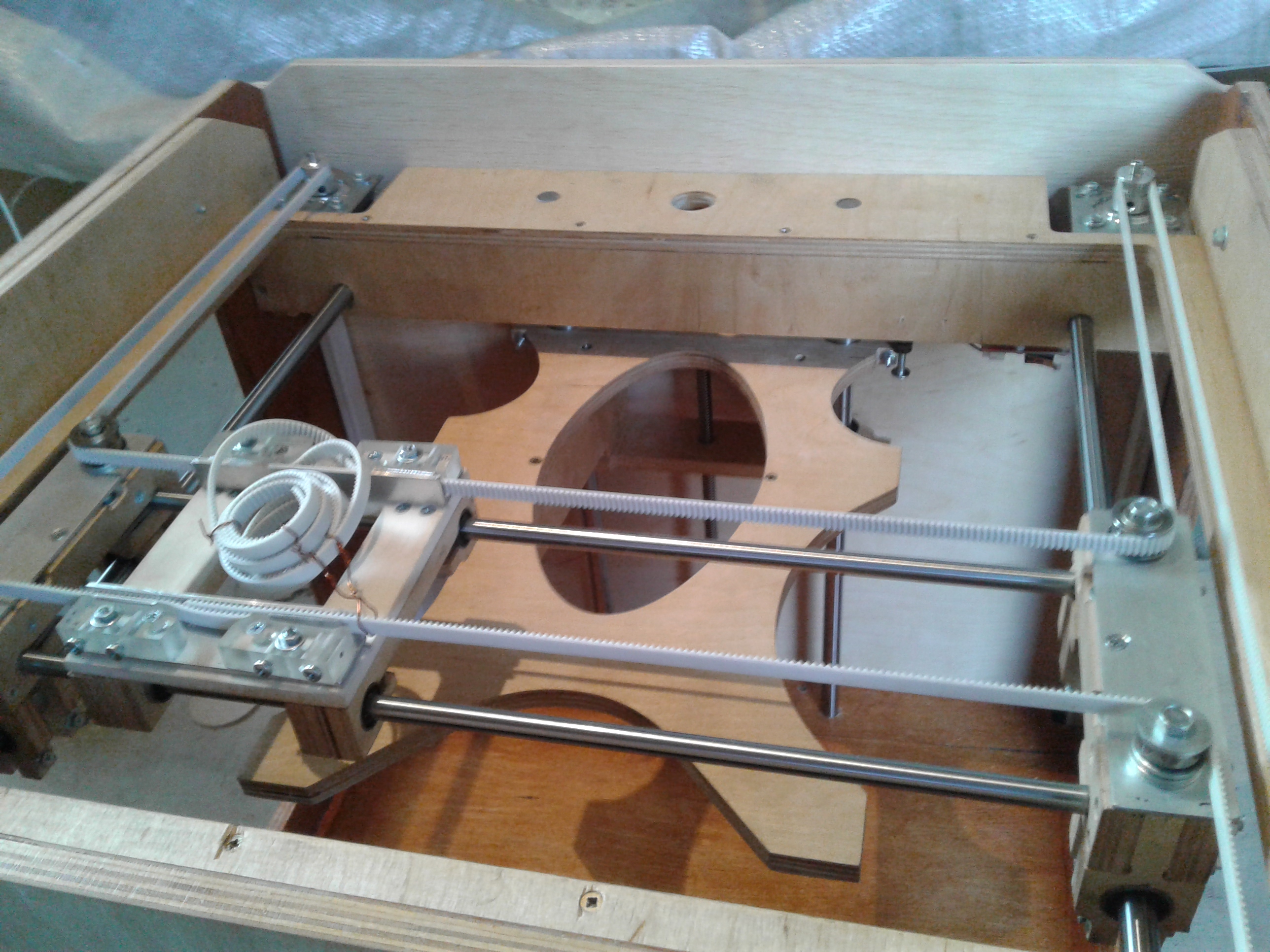 ).Так вот, где-то месяц назад заинтересовался изготовлением 3D принтера, неделя ушла на изучения ситуации и принятия решения по кинематике. Остановился на CoreXY с полем 200х200х200. Проектную разработку начал и закончил в Corel, все размеры высчитывал только там, с под нее же и файлы на резку фанеры готовил. Фанера 10 мм, как потом оказалось 11 мм, резал на своей ЧПУшке, без промахов конечно не обошлось, но не критично.Электроника стандартная Arduino Mega 2560 r3+Ramps 1.4+A4988,Модуль 2004, двигатели 17HS8401- 2шт. Экструдер E3D V6+ MK8(двиг. с механизмом), пока боуден вариант.На данный момент 19.09.2016г все почти собрано в кучу, осталось установить экструдер+привод и стол. Кстати, стол будет МК2, его отдельно будет питать ATX.На рампсе на силовой транзистор стола установлен пластинчатый радиатор, вся плата обдувается двумя 50мм куллерами. Кроме того обдуваться будут двигатели XY, двигатель Z обдувается потоком от ATX. На Z стоит трапеция с шагом 8, шаговый 17HS4401, валы 12, подш. LM12UU-4 шт.