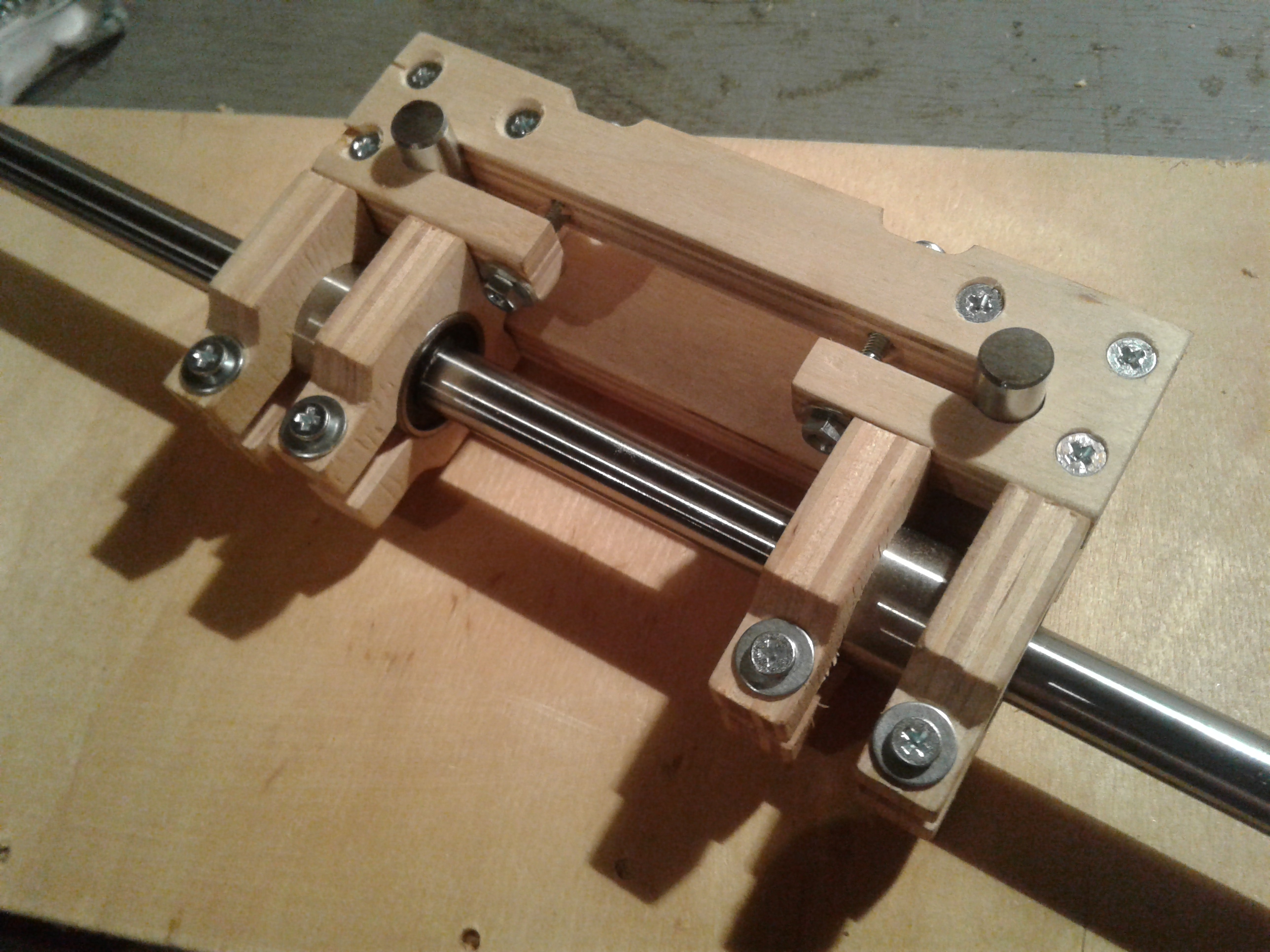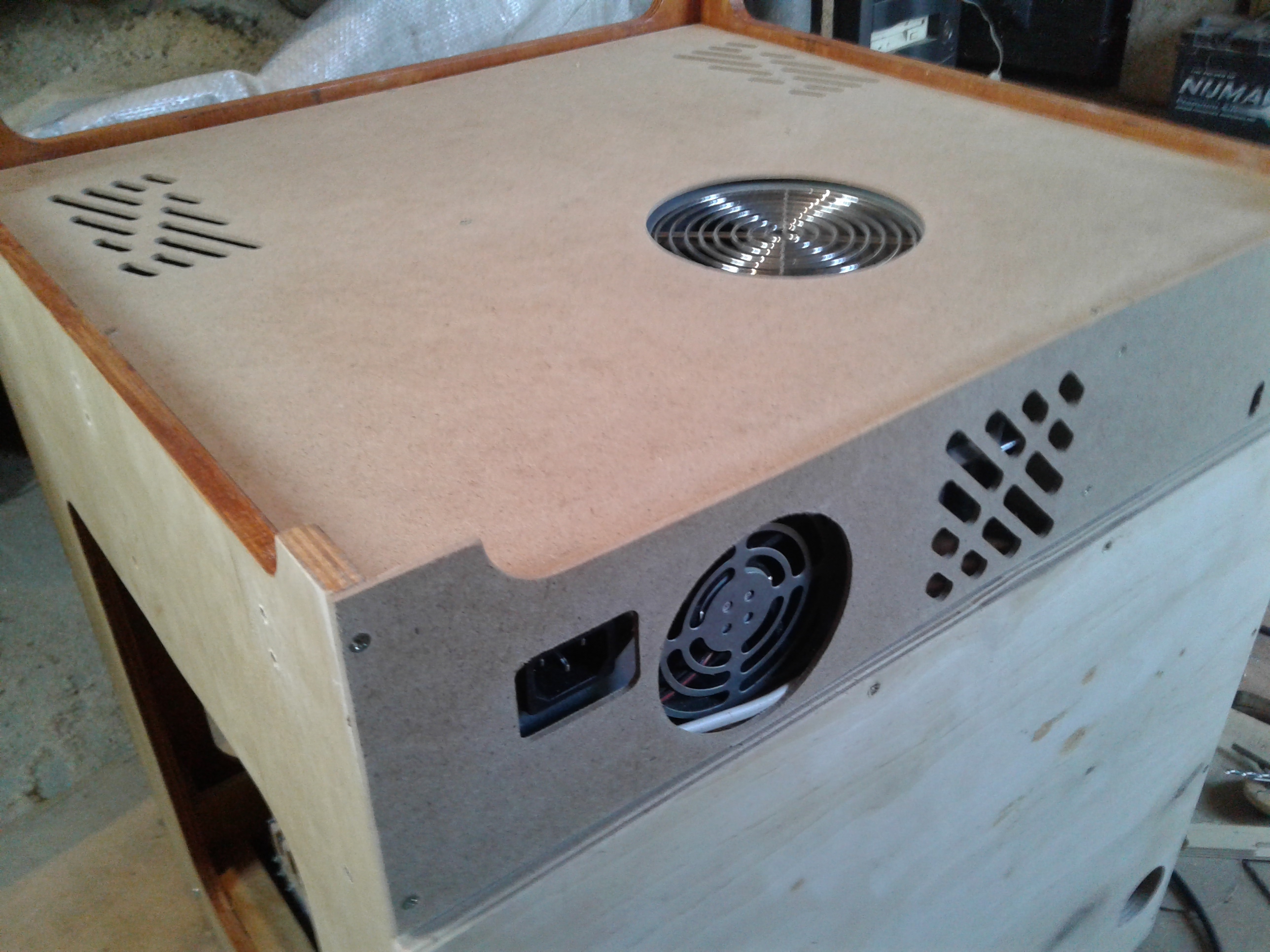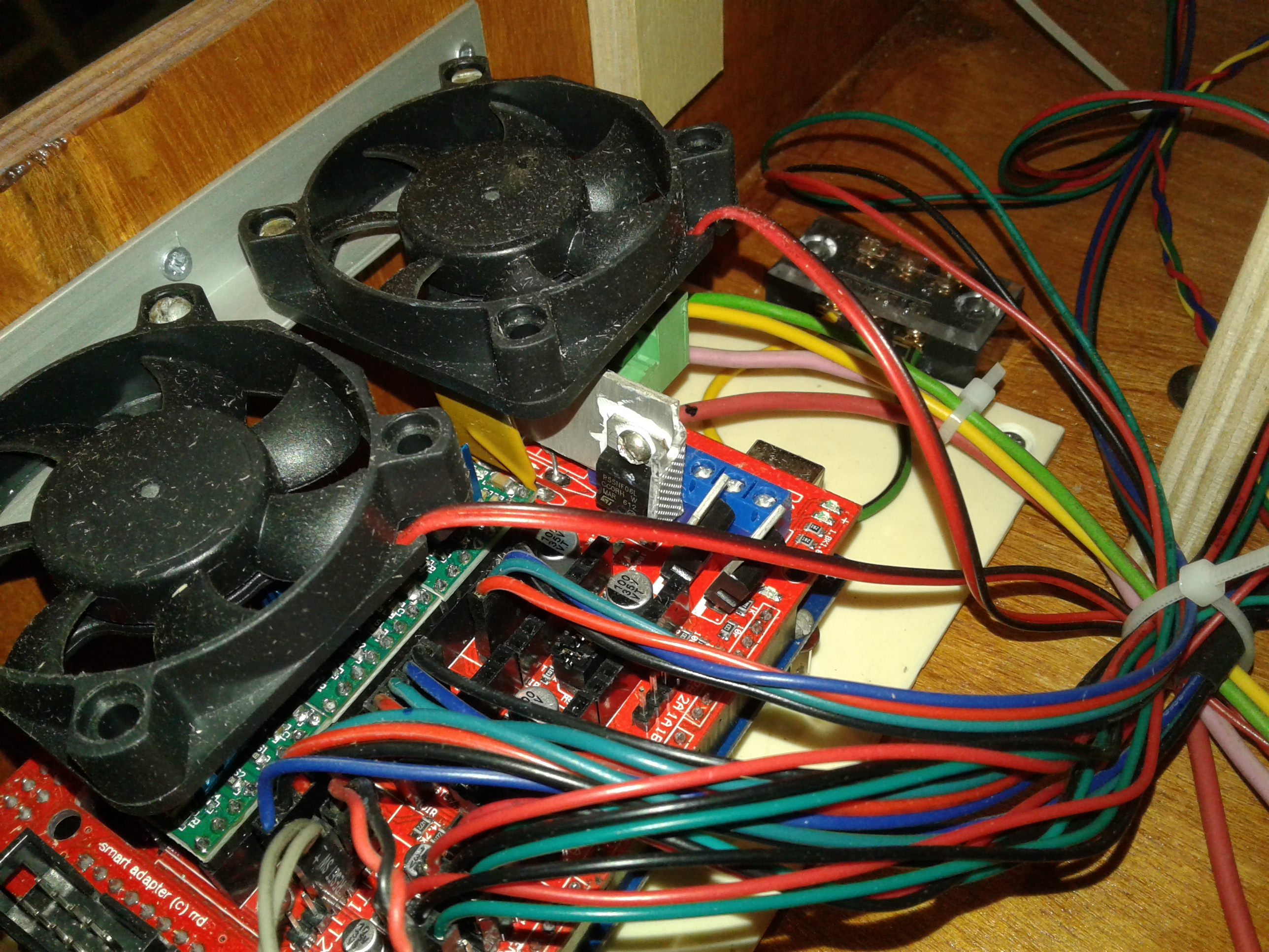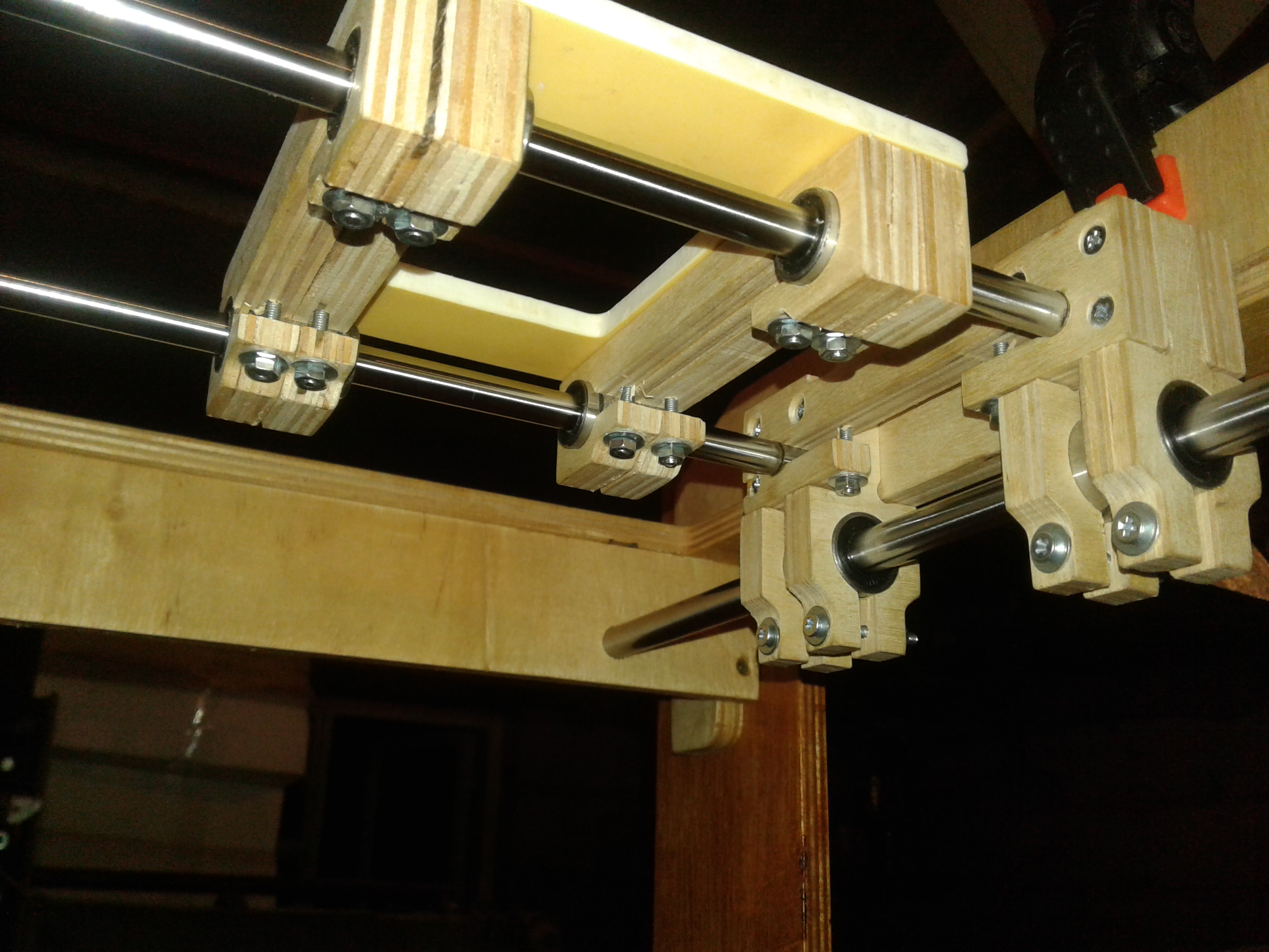 ).Так вот, где-то месяц назад заинтересовался изготовлением 3D принтера, неделя ушла на изучения ситуации и принятия решения по кинематике. Остановился на CoreXY с полем 200х200х200. Проектную разработку начал и закончил в Corel, все размеры высчитывал только там, с под нее же и файлы на резку фанеры готовил. Фанера 10 мм, как потом оказалось 11 мм, резал на своей ЧПУшке, без промахов конечно не обошлось, но не критично.Электроника стандартная Arduino Mega 2560 r3+Ramps 1.4+A4988,Модуль 2004, двигатели 17HS8401- 2шт. Экструдер E3D V6+ MK8(двиг. с механизмом), пока боуден вариант.На данный момент 19.09.2016г все почти собрано в кучу, осталось установить экструдер+привод и стол. Кстати, стол будет МК2, его отдельно будет питать ATX.На рампсе на силовой транзистор стола установлен пластинчатый радиатор, вся плата обдувается двумя 50мм куллерами. Кроме того обдуваться будут двигатели XY, двигатель Z обдувается потоком от ATX. На Z стоит трапеция с шагом 8, шаговый 17HS4401, валы 12, подш. LM12UU-4 шт.