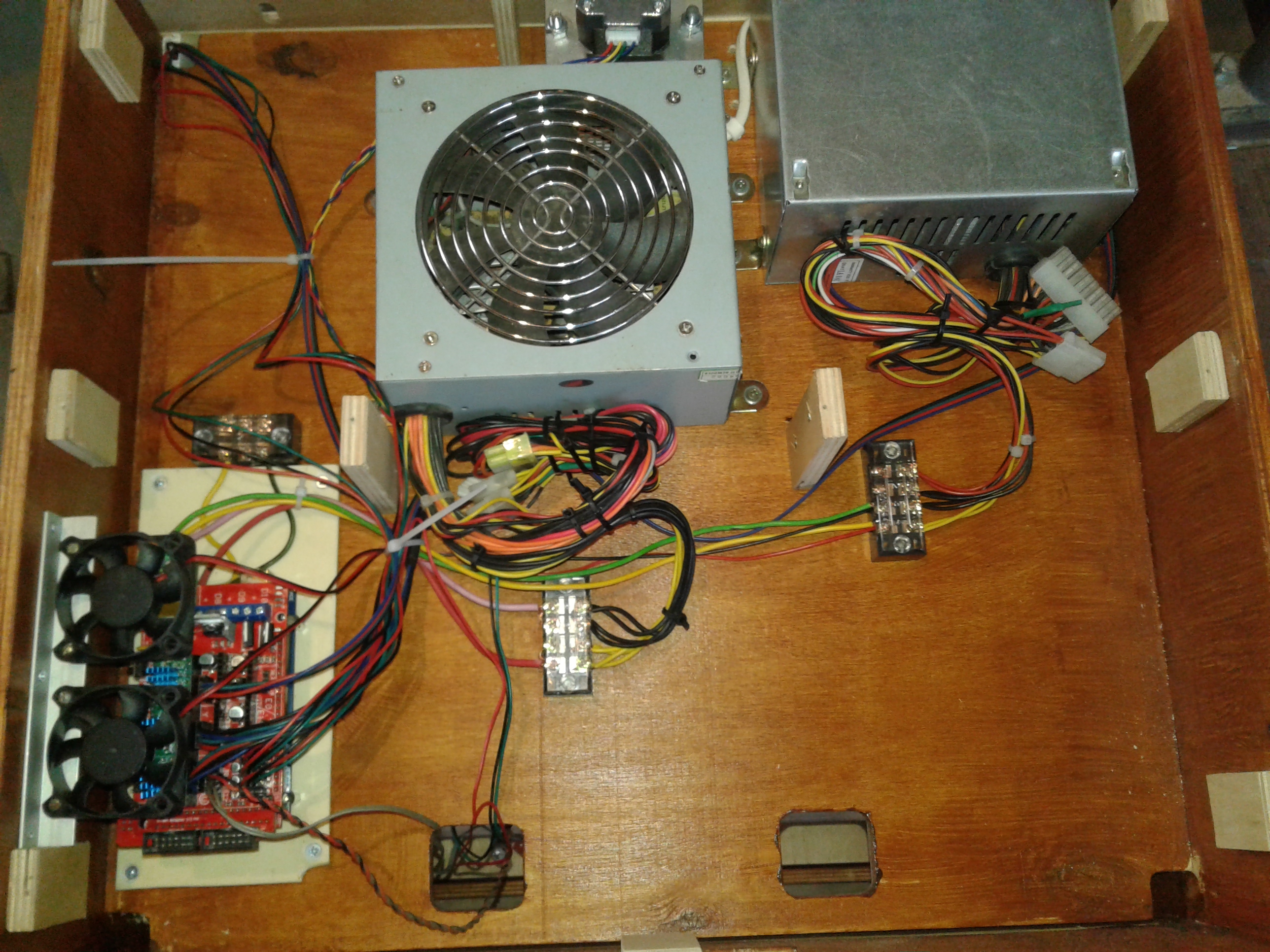 Так вот, где-то месяц назад заинтересовался изготовлением 3D принтера, неделя ушла на изучения ситуации и принятия решения по кинематике. Остановился на CoreXY с полем 200х200х200. Проектную разработку начал и закончил в Corel, все размеры высчитывал только там, с под нее же и файлы на резку фанеры готовил. Фанера 10 мм, как потом оказалось 11 мм, резал на своей ЧПУшке, без промахов конечно не обошлось, но не критично.Электроника стандартная Arduino Mega 2560 r3+Ramps 1.4+A4988,Модуль 2004, двигатели 17HS8401- 2шт. Экструдер E3D V6+ MK8(двиг. с механизмом), пока боуден вариант.На данный момент 19.09.2016г все почти собрано в кучу, осталось установить экструдер+привод и стол. Кстати, стол будет МК2, его отдельно будет питать ATX.На рампсе на силовой транзистор стола установлен пластинчатый радиатор, вся плата обдувается двумя 50мм куллерами. Кроме того обдуваться будут двигатели XY, двигатель Z обдувается потоком от ATX. На Z стоит трапеция с шагом 8, шаговый 17HS4401, валы 12, подш. LM12UU-4 шт.
