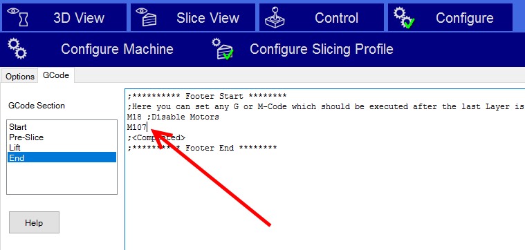 чтобы подсветка выключалась в конце, добавь в секции End, код окончания M107, после строки M18 ;Disable Motors