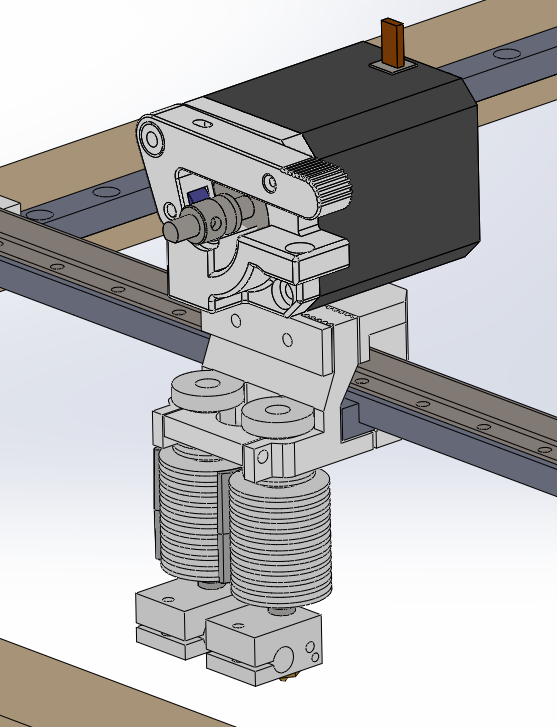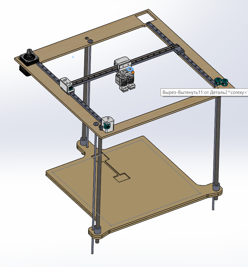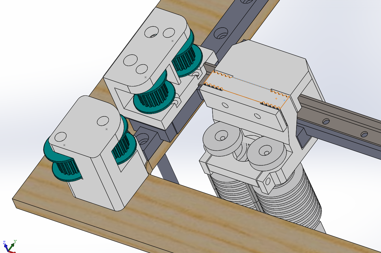 Рельсы 9, валы 10мм, ремень гт2-9мм. Шпули на моторах 16з, ролики 20з. Ремни в одной плоскости. Перекрещивание с переворотом ремней.