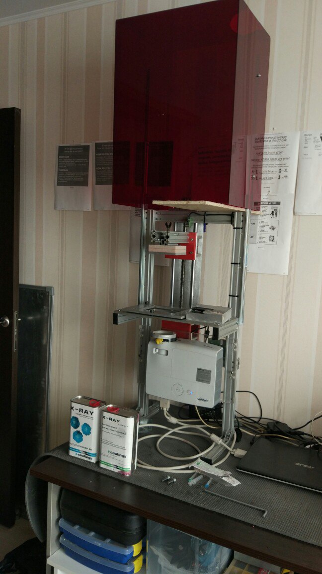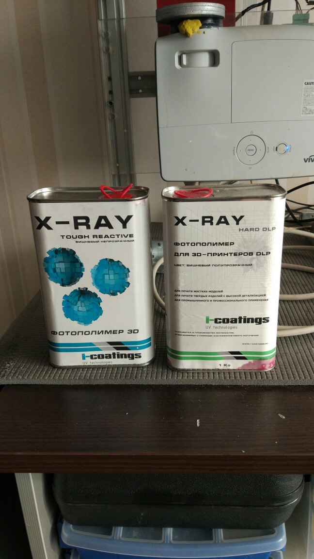 Итак, достался мне по случаю комплект оборудования, состоящий из стереолитогафического принтера авторской сборки, двух банок фотополимера и Канистры силикона noname (литра 4 наверное) с отвердителем.