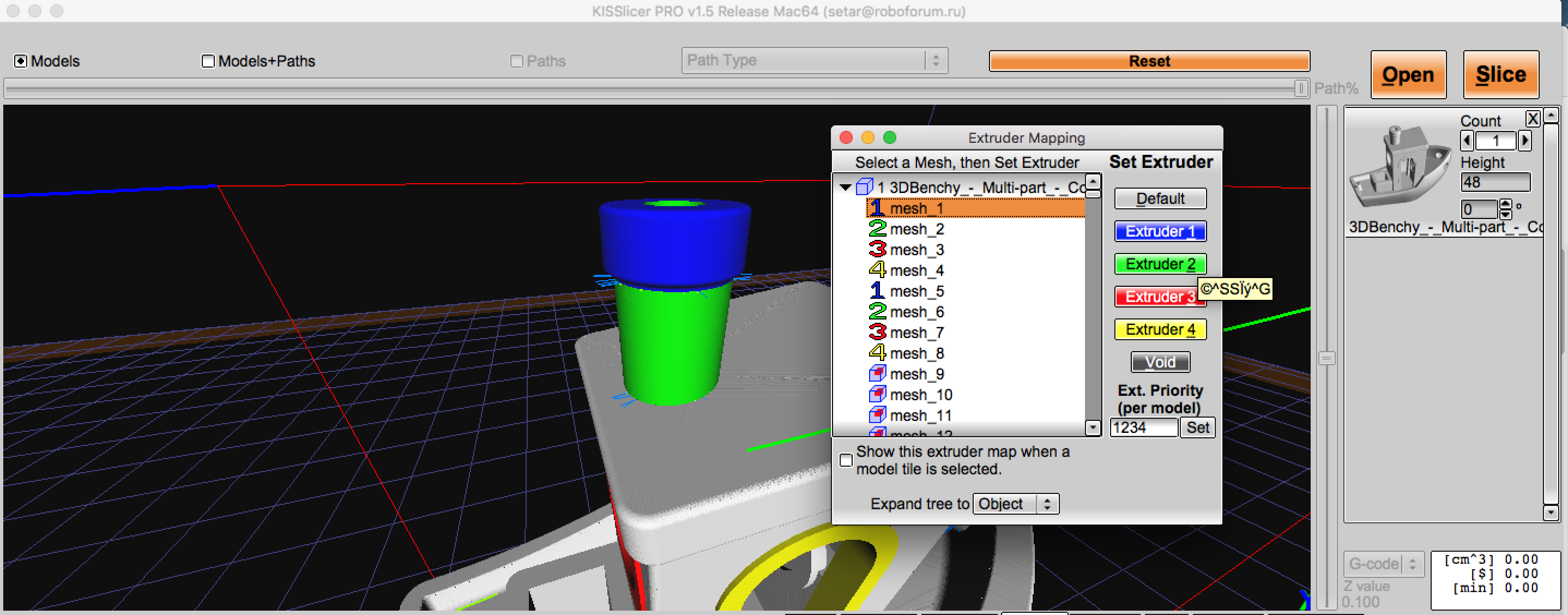 на стадии слайсинга параллельно с выбором нити выбор цвета пластика в экструдере