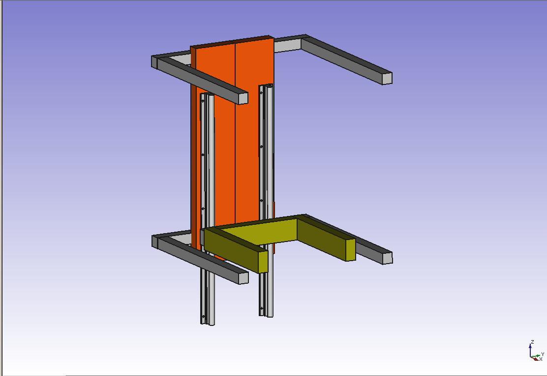 Дальше стало понятно, что несущий корпус в виде куба особо не нужен. Для задания правильного положения стола нужен только силовой треугольник, включающий вертикальные профили 30x60 с направляющими валами. Предполагается, что его можно создать вставив горизонтальные распорки под углом 45 градусов.