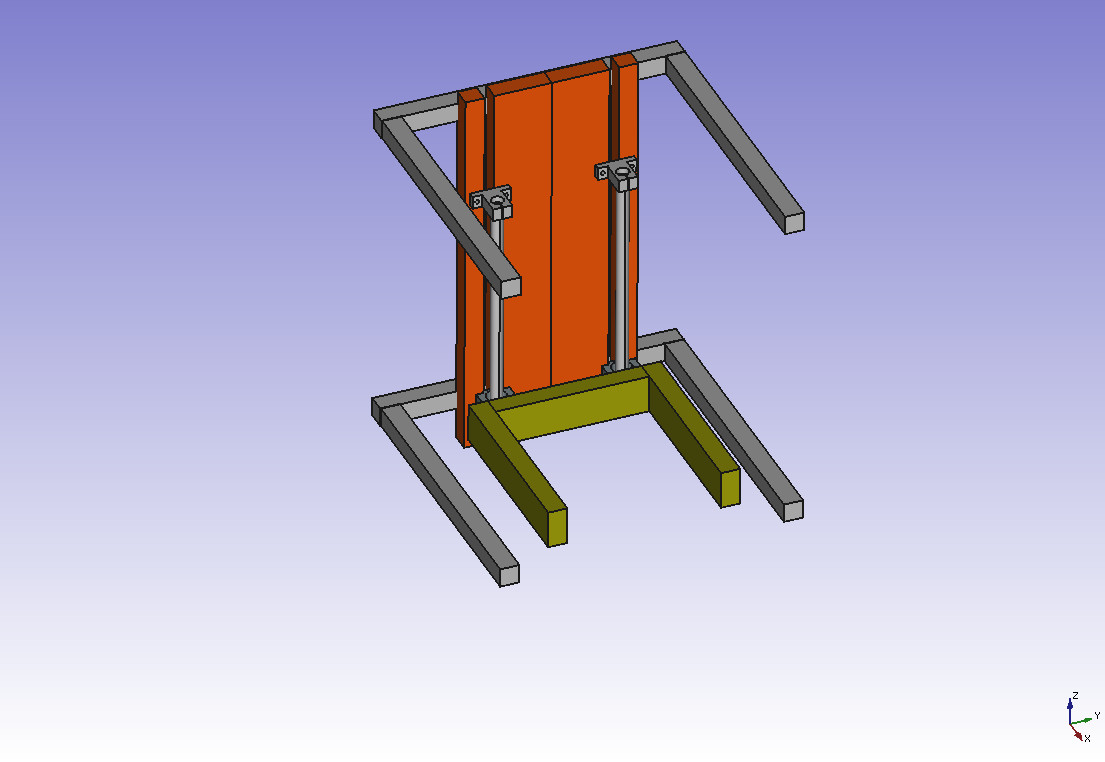 Дальше стало понятно, что несущий корпус в виде куба особо не нужен. Для задания правильного положения стола нужен только силовой треугольник, включающий вертикальные профили 30x60 с направляющими валами. Предполагается, что его можно создать вставив горизонтальные распорки под углом 45 градусов.