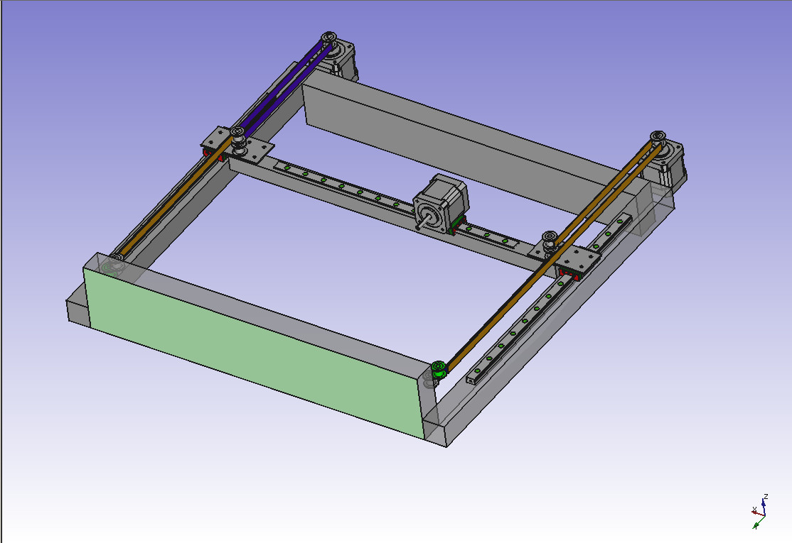 Шаговые двигатели и ШВП пока не показаны. Предполагается их размещение с трех сторон (один сзади стола рядом с направляющей, еще два максимально близко к передним углам основания стола).