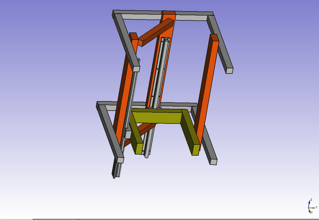 Дальше стало понятно, что несущий корпус в виде куба особо не нужен. Для задания правильного положения стола нужен только силовой треугольник, включающий вертикальные профили 30x60 с направляющими валами. Предполагается, что его можно создать вставив горизонтальные распорки под углом 45 градусов.