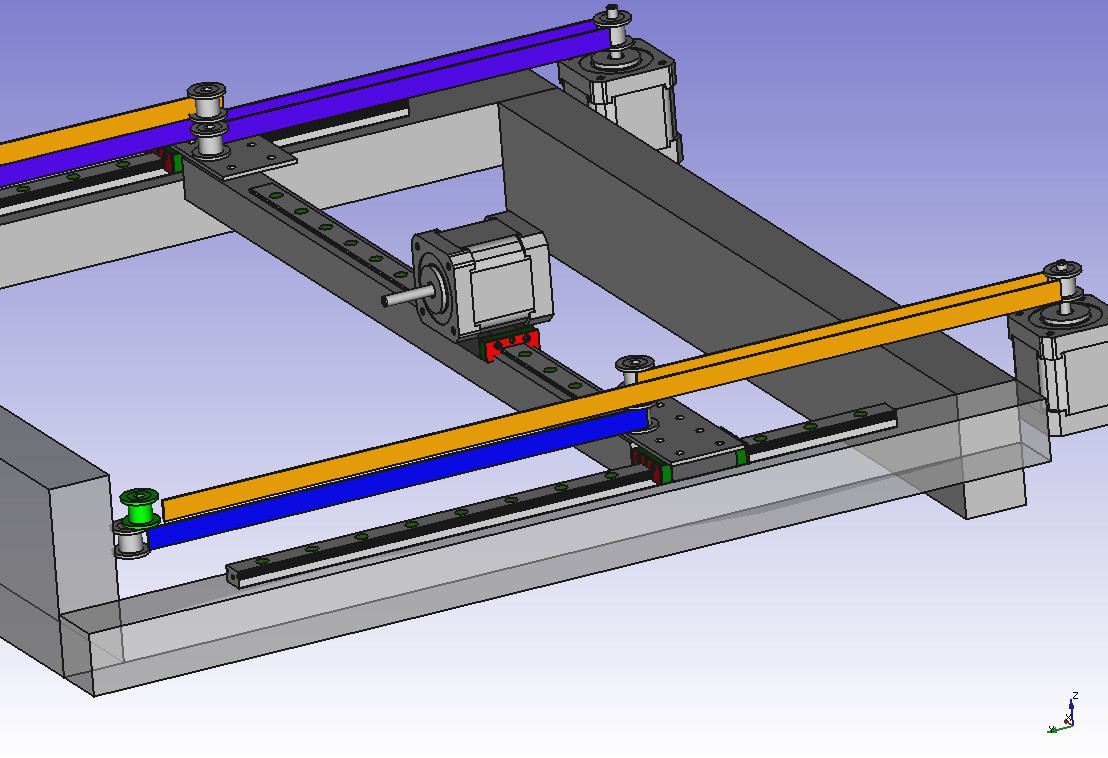 Шаговые двигатели и ШВП пока не показаны. Предполагается их размещение с трех сторон (один сзади стола рядом с направляющей, еще два максимально близко к передним углам основания стола).