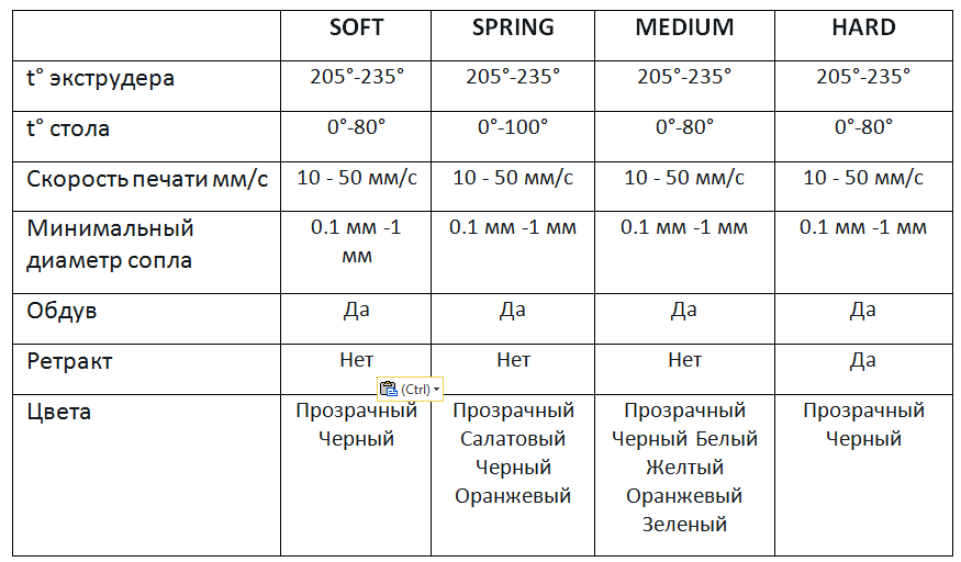 Требует для печати экструдер c отсутствием зазора между подающей шестерней и приемником пластика экструдера.(https://www.thingiverse.com/thing:2051570). Для печати составами SPRING и SOFT необходим экструдер с прямой подачей.