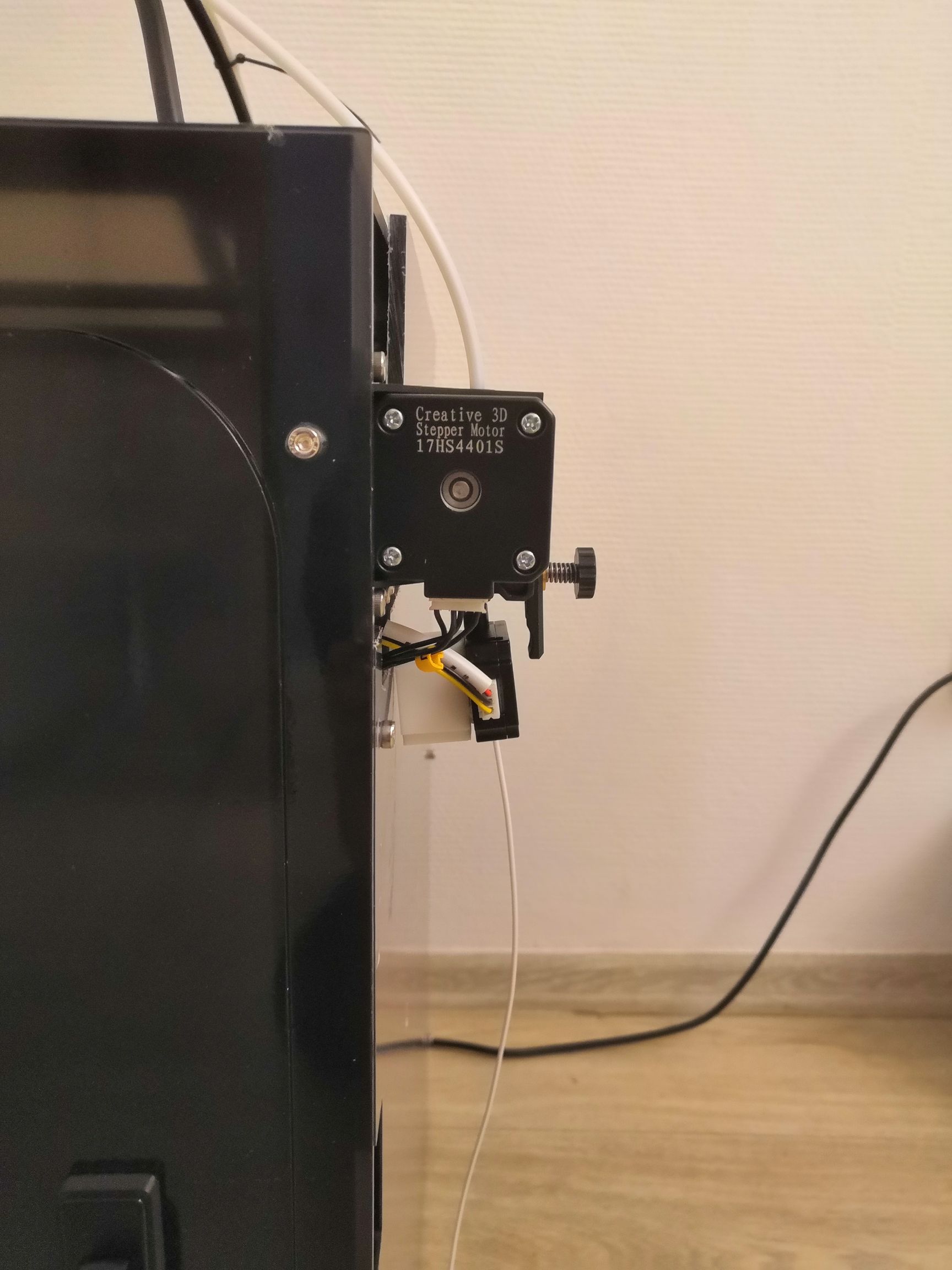 По всякому крутил, вертел экструдер, в поисках места установки. В итоге пришлось экструдер вместе с мотором вынести за принтер. В любом случае, если буду делать термокамеру, то придётся ставить либо direct либо СЖО. Но пока так попробую печатать. Осталось закрепить кронштейн для датчика окончания филамента