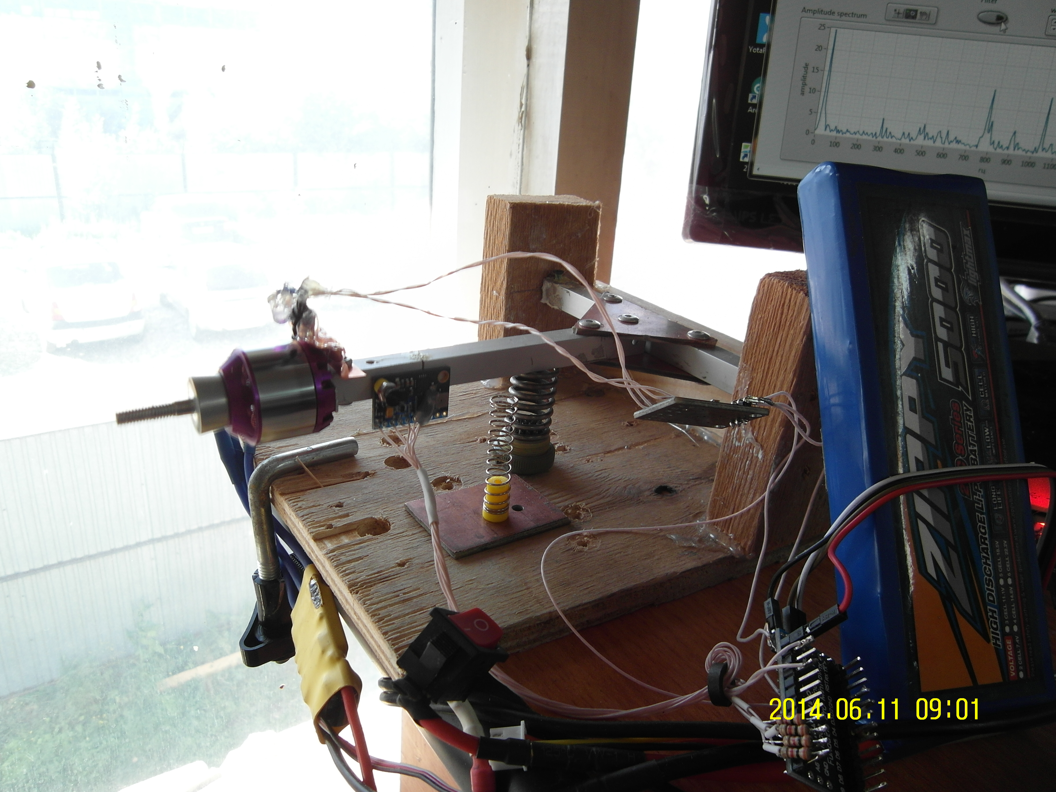 тут у нас прием всего,корректировок всякого, есть подсчет оборотов, есть фильтр данных с акселя, есть выдача фильтрованных данных за 1 оборот в полярных координатах (кружки такие получаются когда синусоида четкая). Ну и собственно считается всякими хитрыми преобразованиями спектр всего этого дела. Можно с обработанных и необработанных данных считать. Отдельно просматривается наш рабочий диапозон (10Гц это 600об\мин 100Гц-6000об\мин). Для нашей частоты смотрим фазу вычитаем фазу сигнала оптопары и находим искомое смещение масс. Уровень того смещения у нас по амплитуде смотрится. На графике 10 последних значений рисуются. Исходник под labview 13 (там еще надо ставить visa,robotics модули):