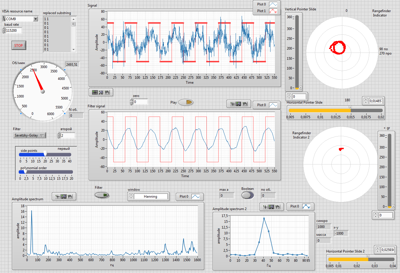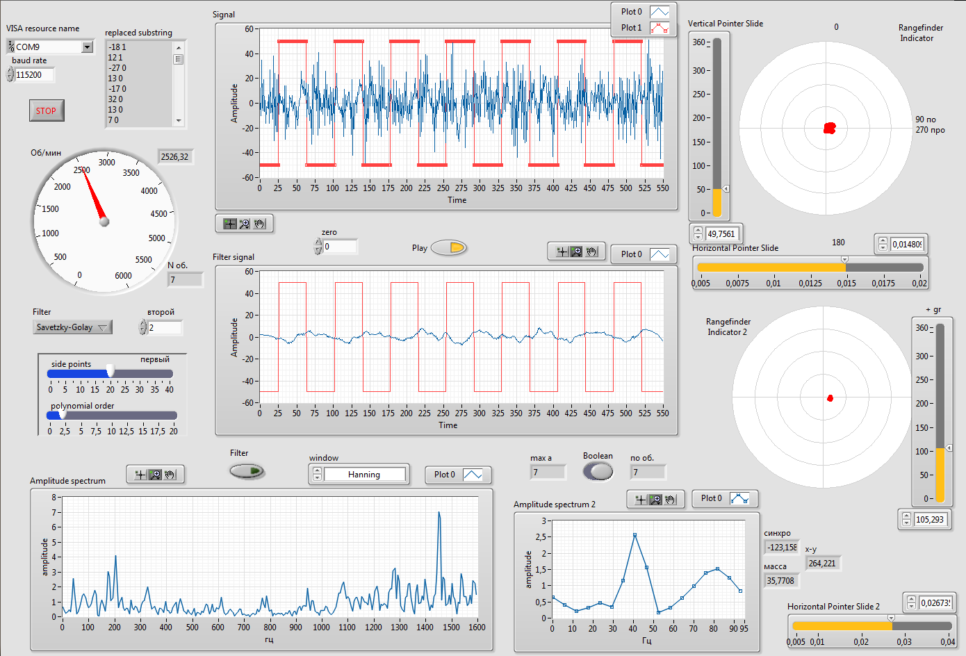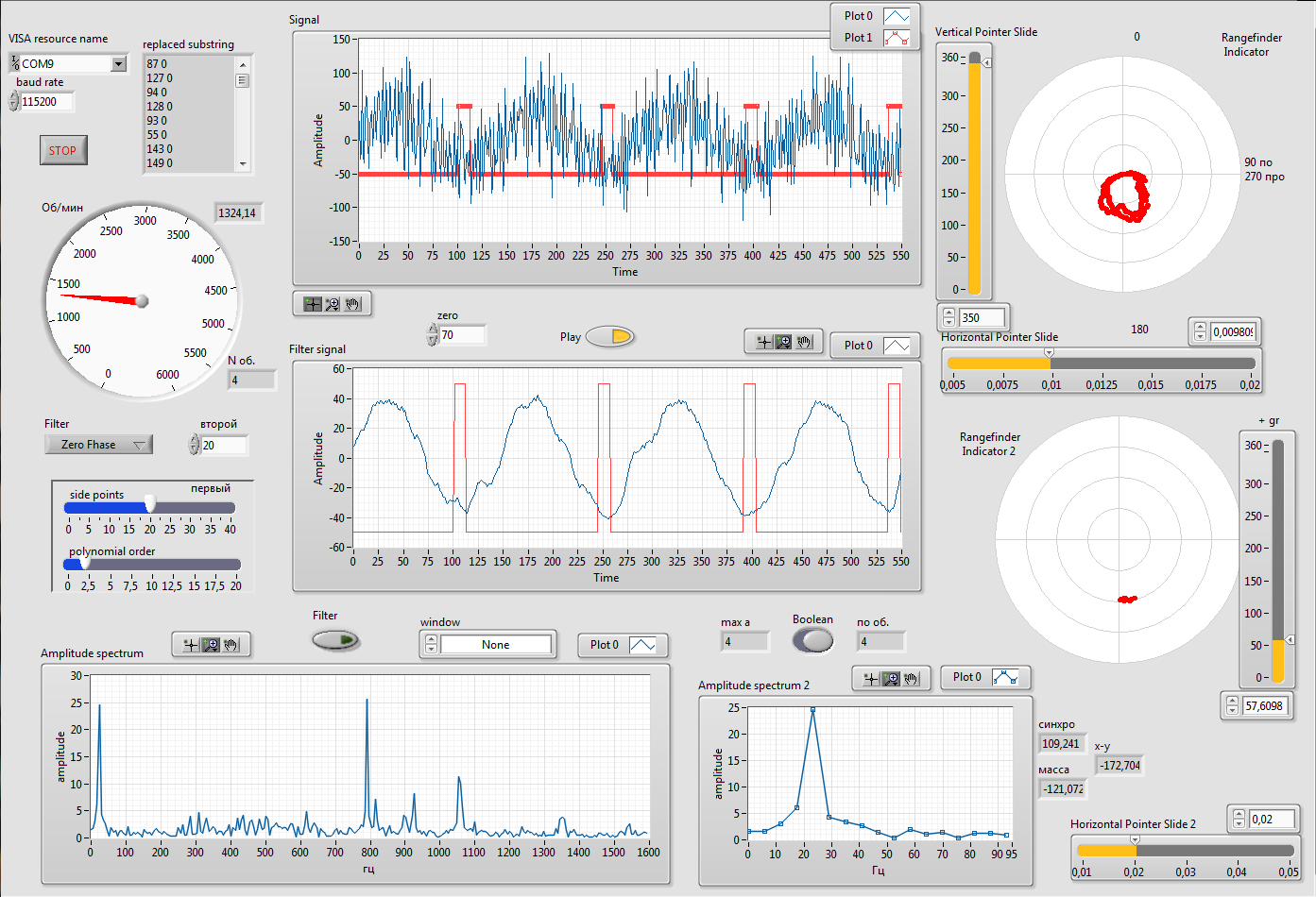 тут у нас прием всего,корректировок всякого, есть подсчет оборотов, есть фильтр данных с акселя, есть выдача фильтрованных данных за 1 оборот в полярных координатах (кружки такие получаются когда синусоида четкая). Ну и собственно считается всякими хитрыми преобразованиями спектр всего этого дела. Можно с обработанных и необработанных данных считать. Отдельно просматривается наш рабочий диапозон (10Гц это 600об\мин 100Гц-6000об\мин). Для нашей частоты смотрим фазу вычитаем фазу сигнала оптопары и находим искомое смещение масс. Уровень того смещения у нас по амплитуде смотрится. На графике 10 последних значений рисуются. Исходник под labview 13 (там еще надо ставить visa,robotics модули):