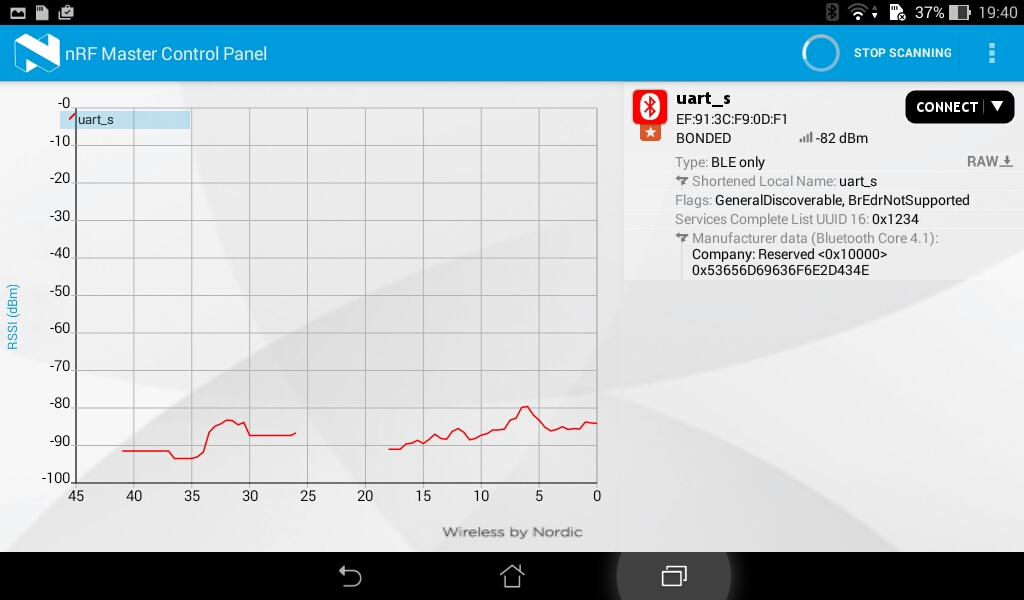 Вот скриншот с планша. Он видит ble плату, график rssi. До 20й секунды я поворачивался на месте, потом сделал пару шагов в сторону модуля. Да, на модуле нет антенны.