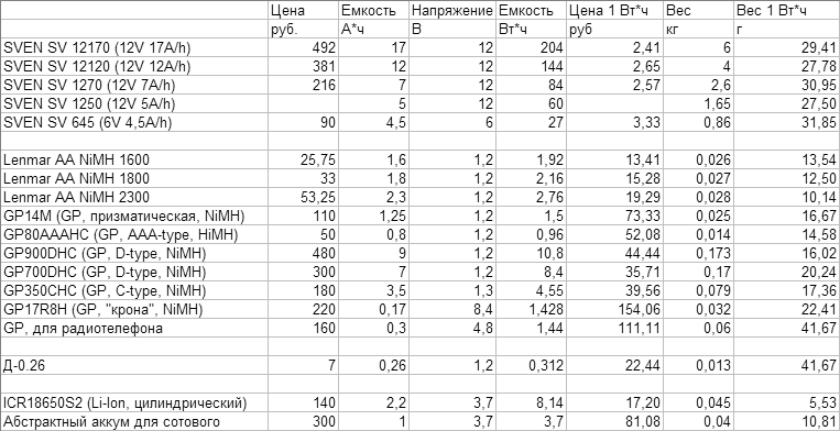 Как и ожидалось, свинцовые аккумы имеют самую низкую цену в пересчете на 1 Вт*ч.