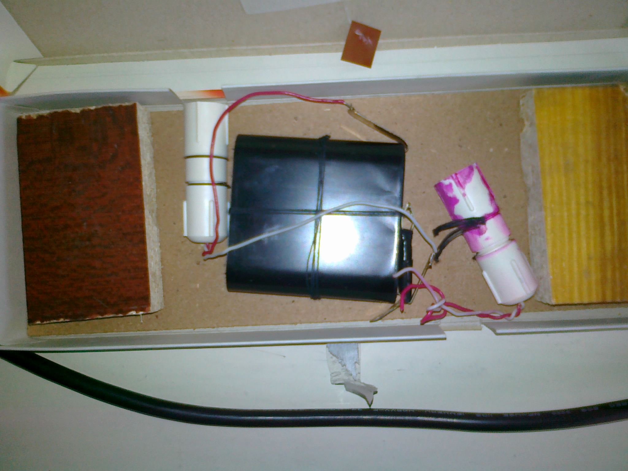 Два пластиковых цилиндра соединены с батарейкой. Каждый из них заполнен внутри какой то красной жидкостью.