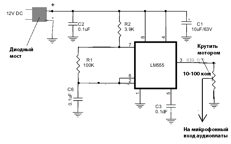 Коллеги! Для управления сочленениями робота BoBot придумал угломер на базе НЧ-генератора. Он будет подавать сигнал до 1 кГц на микрофонный вход компьютера робота, а при вращении конечности выходной резистор будет изменять громкость звука пропорционально углу поворота. Вот схема: