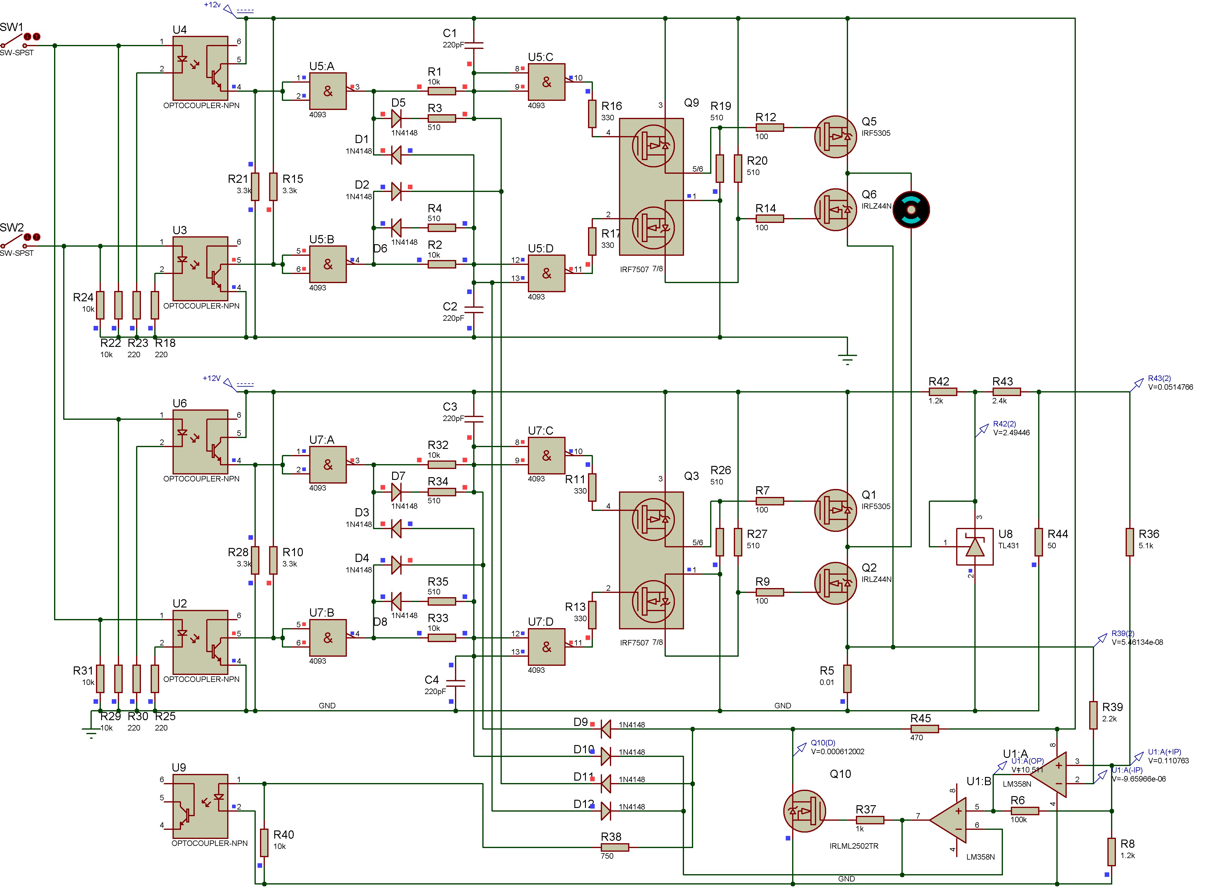 День добрый. При разработке устройства слежения за солнцем возникла необходимость в приводе. Разработал свою схему h-brige. Из данных - двигатель 12 В 4-7 А. Буду благодарен за любую критику, так как это первая моя схема моста. Сразу же возник вопрос: