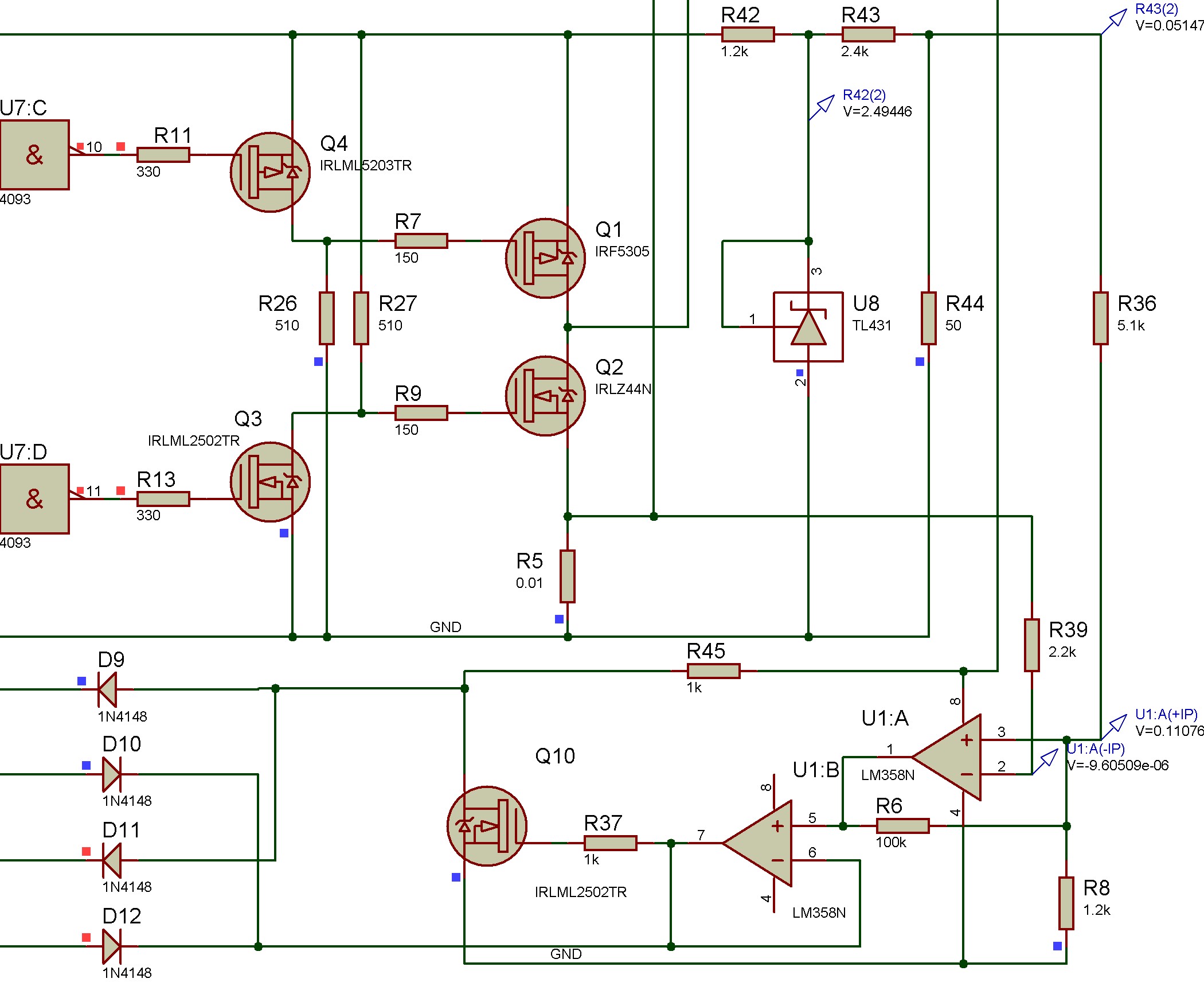 Я поставил шунт для контроля тока. Защита срабатывает при 11 А. С шунтом такого номинала (0,01 Ом) напряжение на шунте будет 0,11 В. В схеме которую приложил стоит LM358, а реально считал на LM393 (нету модели этого компаратора в Proteus). Петля гистерезиса около 0,1 В (0,01-0,11), опорное напряжение задал 0,05 В. При таких напряжениях нормально ли будет работать компаратор или все же сделать на LM358 - одним ОУ усилить раз в десять, а второй использовать в качестве компаратора?.